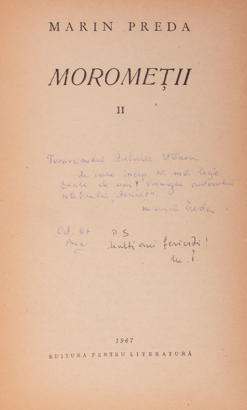 50. "Moromeţii", de Marin Preda, vol. II, 1967, Bucureşti, cu dedicaţia autorului către Zaharia Stancu