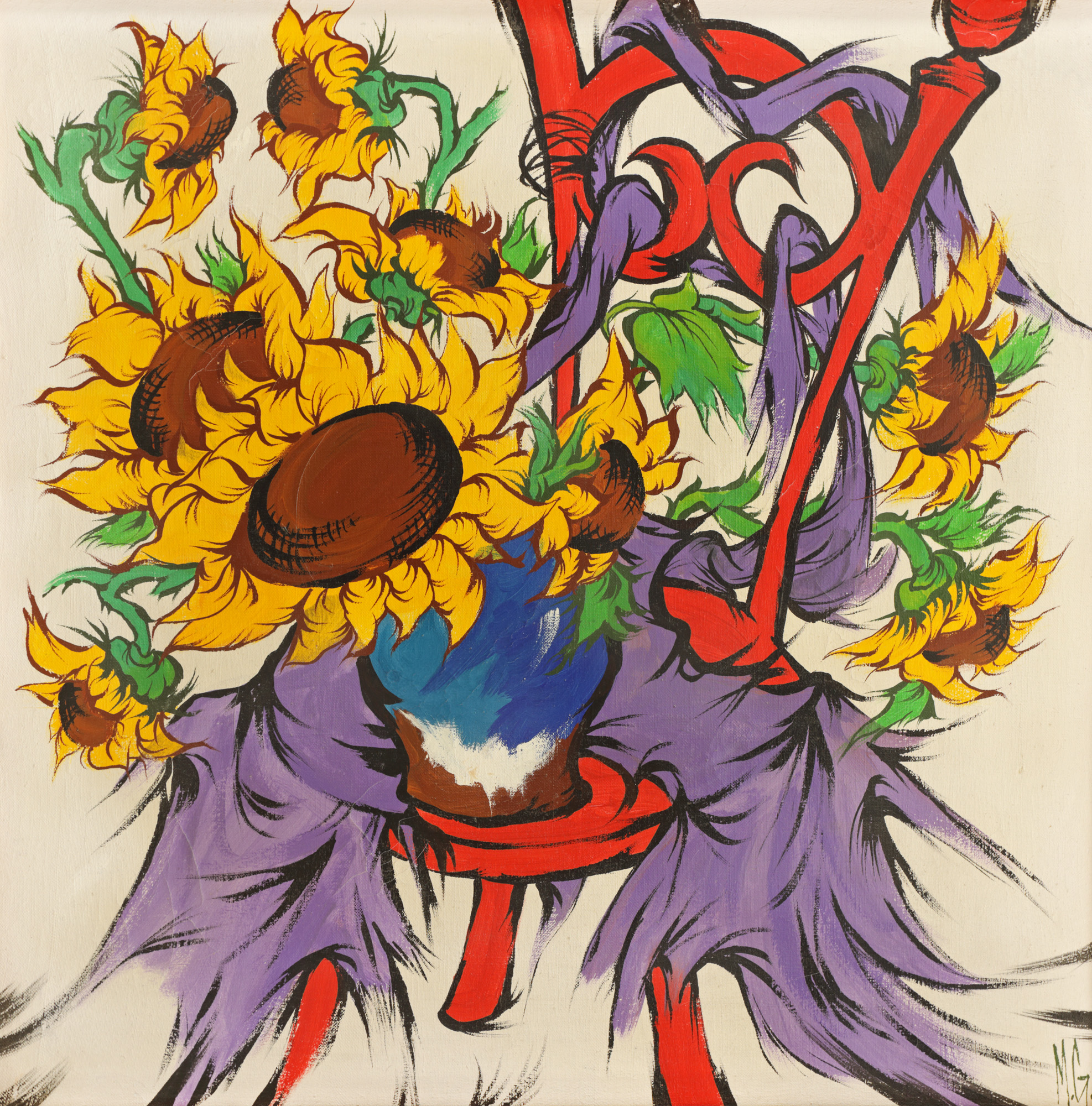 semnat dreapta jos, cu negru, "MG"; semnat, datat și intitulat pe verso, cu negru, "MG, 2003, Scaunul Roșu"