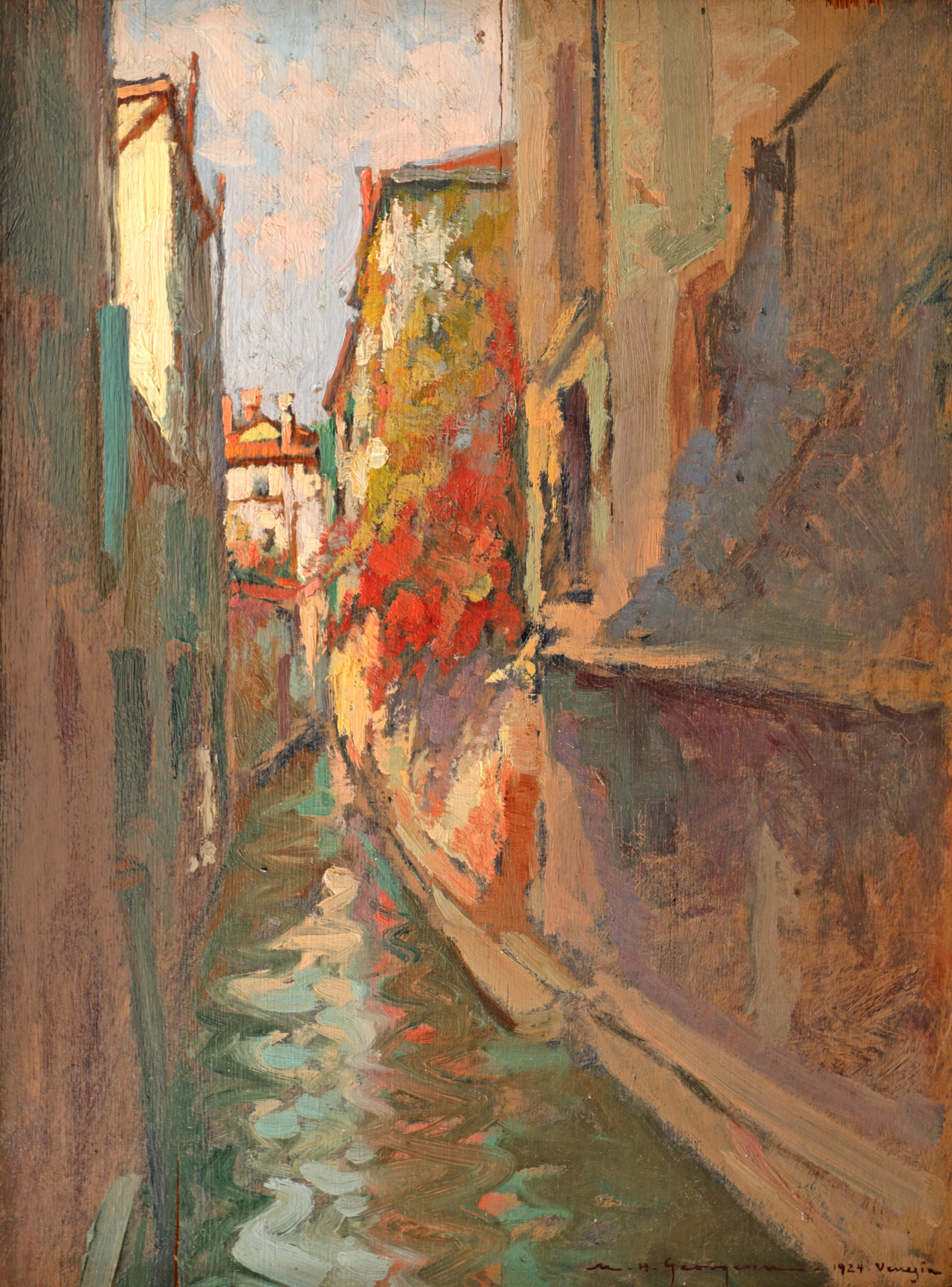 semnat, datat și localizat dreapta jos, cu brun, ”M.H. Georgescu, 1924, Venezia”