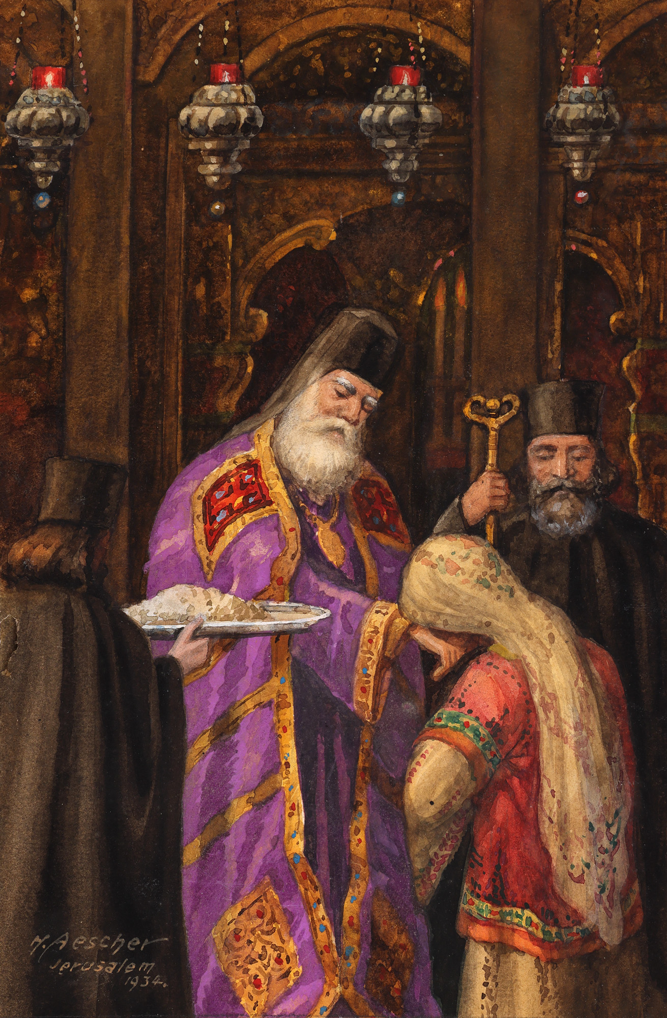semnat, datat și localizat stânga jos, cu gri, "H. Aescher, 1934, Jerusalem"
