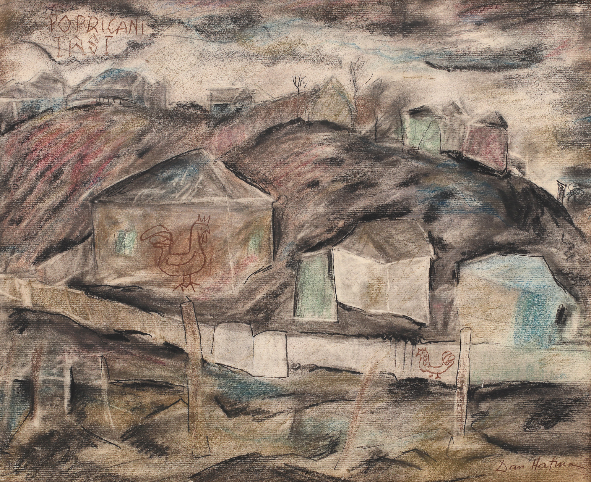 semnat dreapta jos, cu brun, ”Dan Hatmanu”; localizat stânga sus, în creion, ”Popricani, Iași”