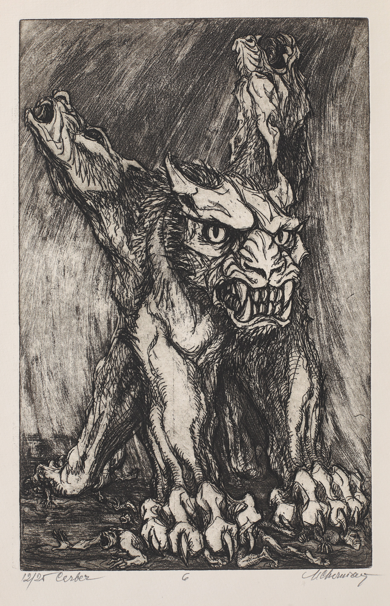 semnat dreapta jos, sub cadru, în creion, ”M. Chirnoagă”; numerotat și intitulat stânga jos, sub cadru, în creion, ”12/25, Cerber”