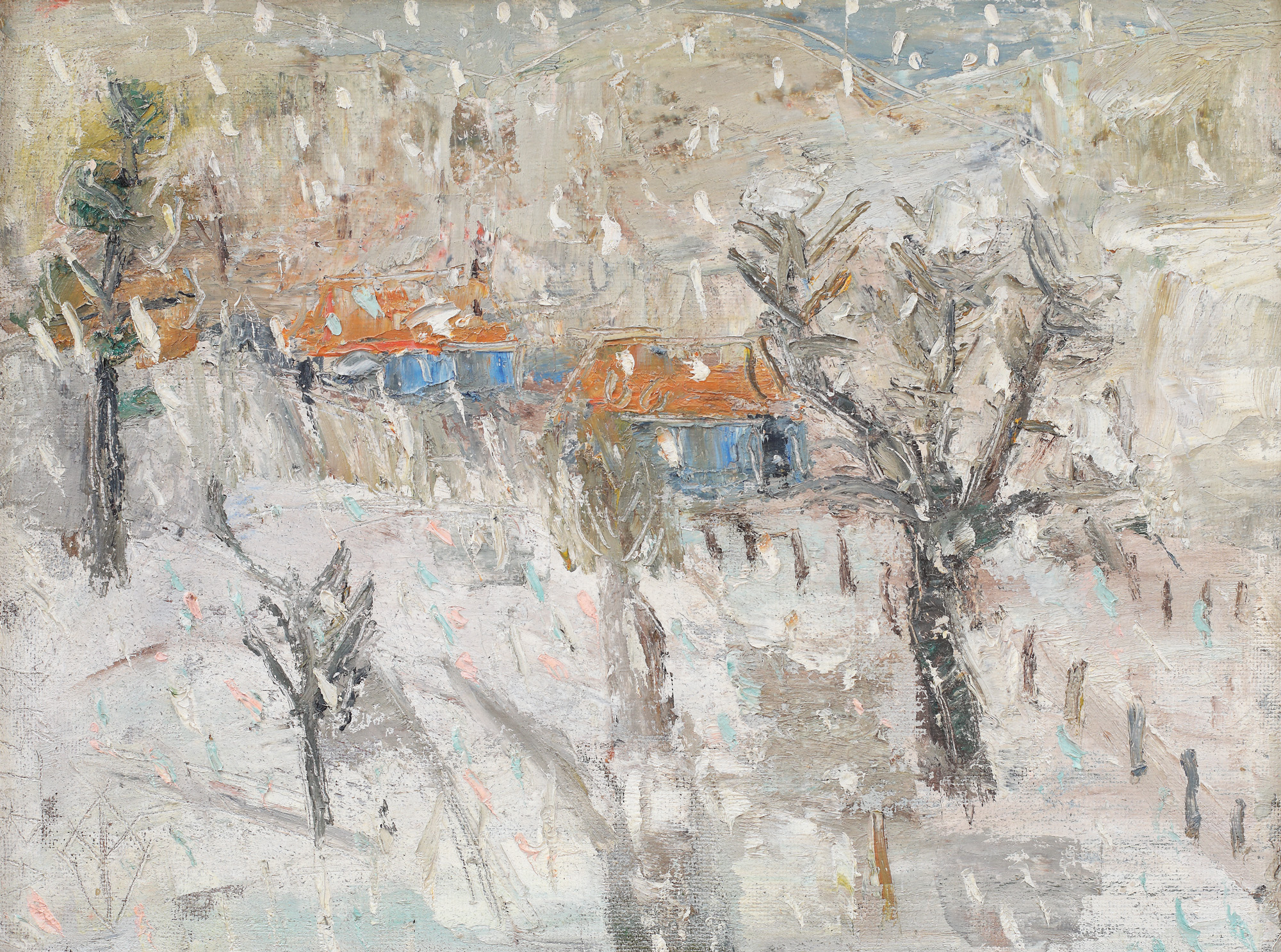 semnat stânga jos, în pastă, în monogramă,”IV”; semnat, datat și intitulat, pe verso, cu negru, ”Ion Vlasiu, Iarnă la Bistra, 1973”