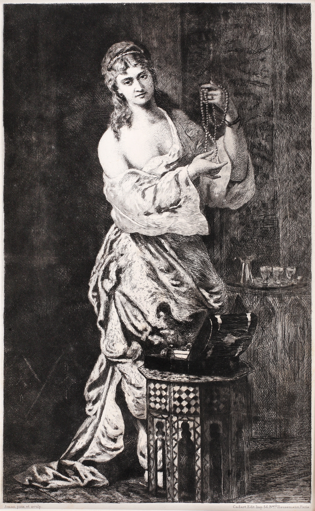semnat stânga jos, sub cadru, ”Aman, pinx. et sculp.”; menționată editura, dreapta jos, sub cadru, ”Cadart. Edit. Imp. 56, Bard Haussmann, Paris.”
