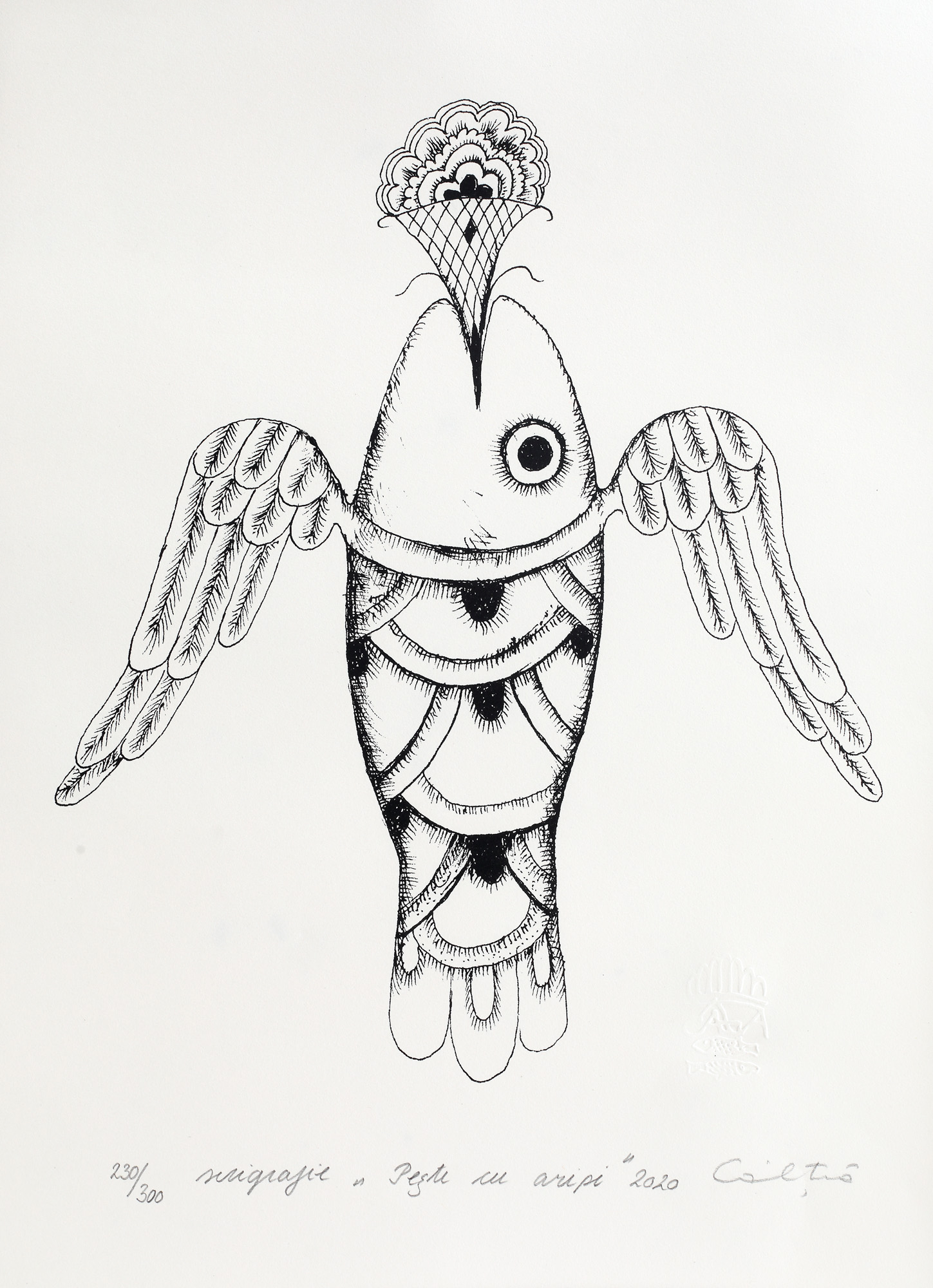 semnat, datat, intitulat și numerotat central jos, în creion, ”230/300, serigrafie, Pește cu aripi, 2020, Câlția”