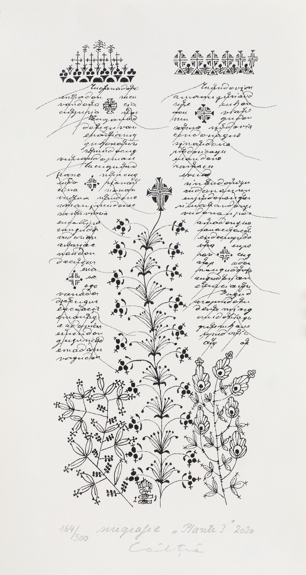 semnat, datat, intitulat, numerotat și notat central jos, în creion, "Câlția, 2020, Plante I, 164/500. serigrafie"