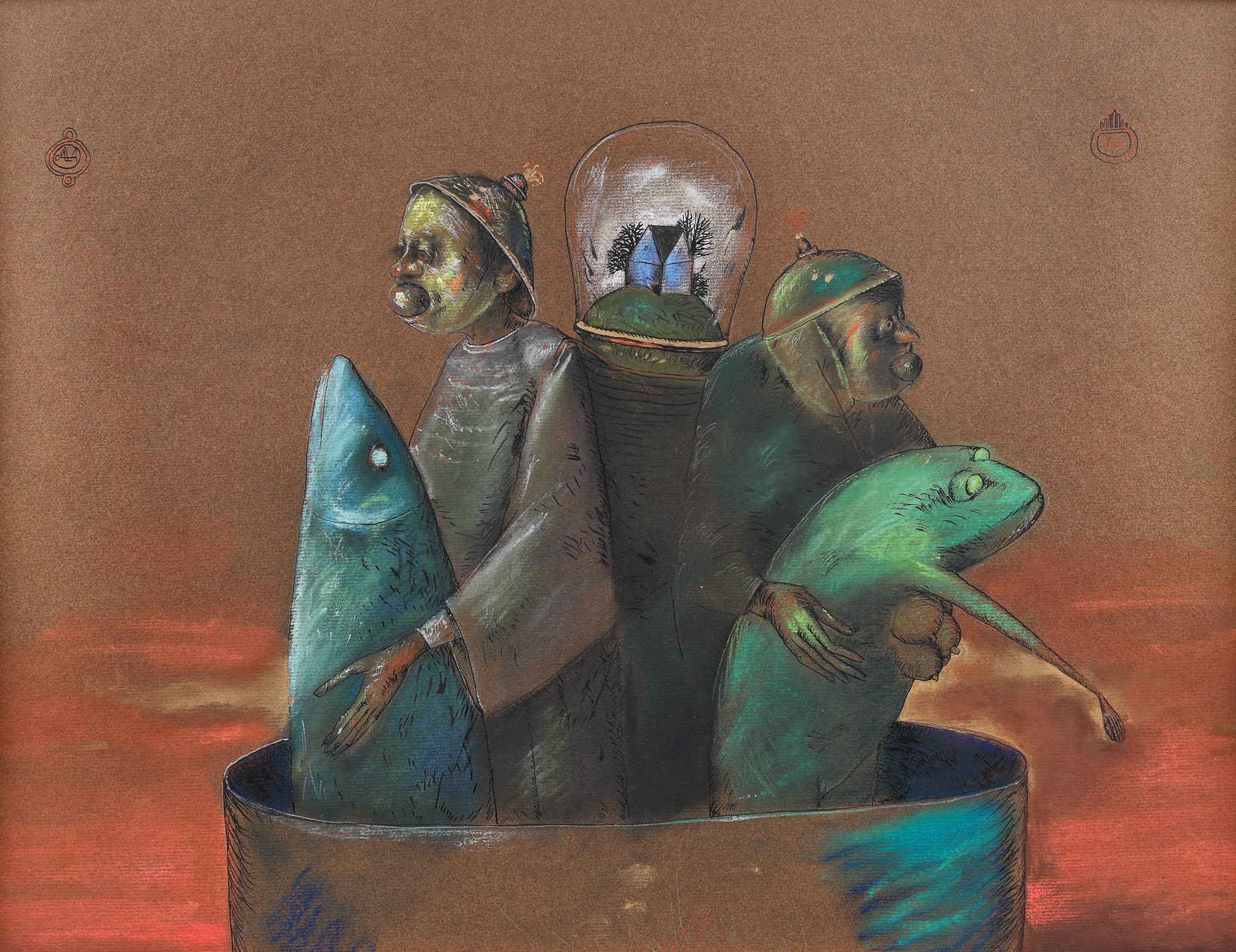 pastel, acrilic, guașă și tuș pe hârtie colorată lipită pe carton
