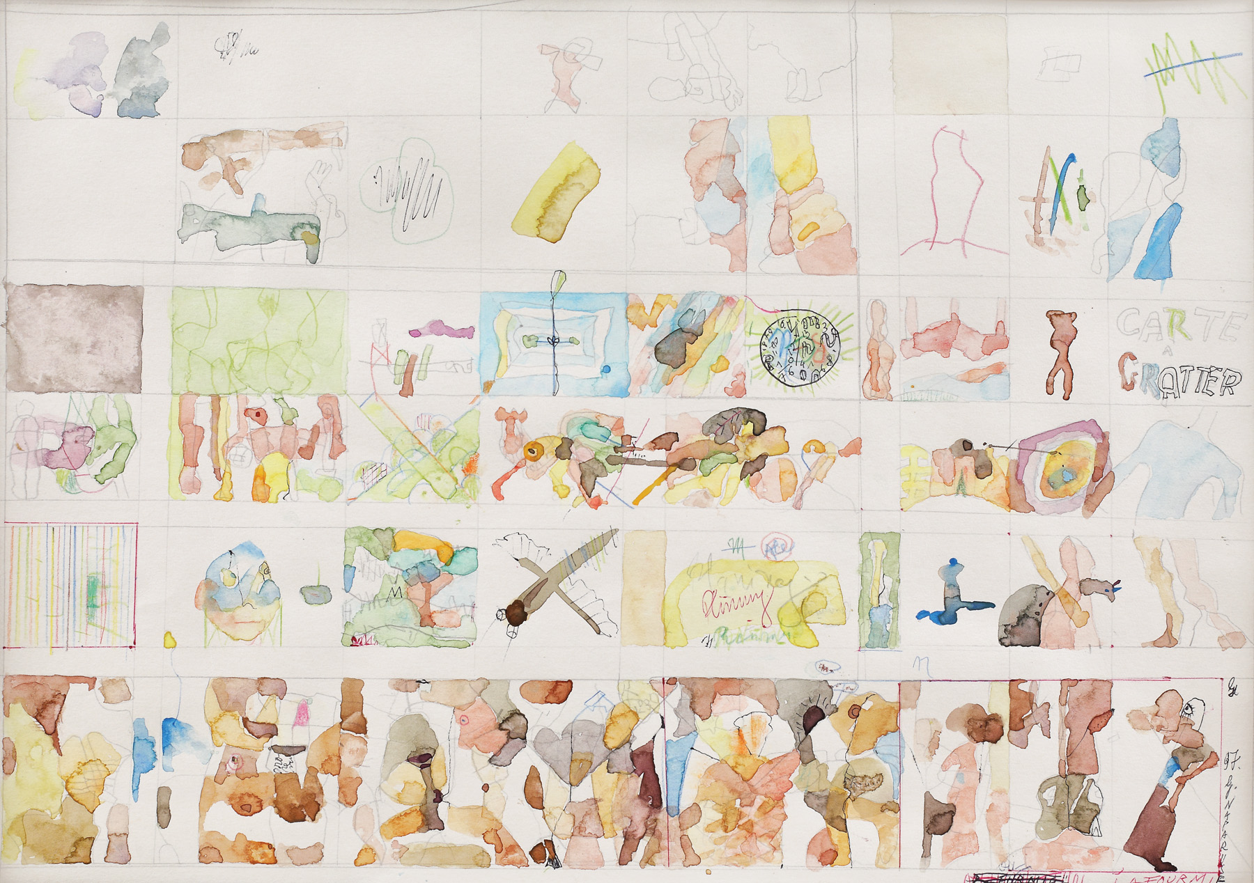 creion, acuarelă, creioane colorate și pix pe carton