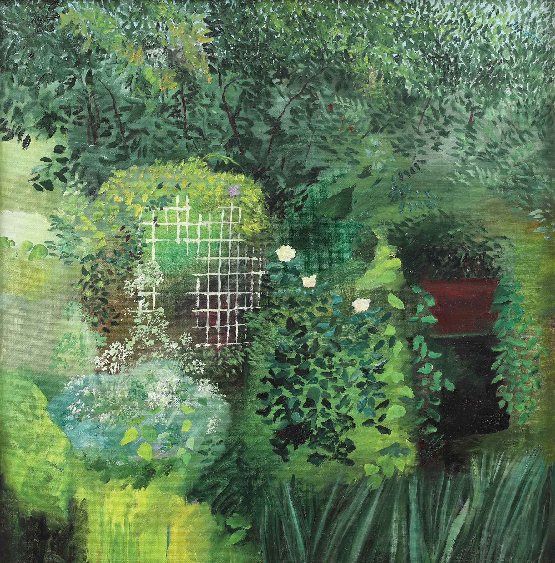 semnat, datat și intitulat pe verso, "Florin Niculiu, Grădină în august, 1990"