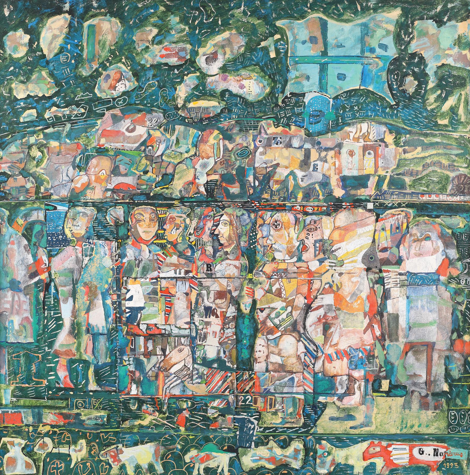 semnat și datat dreapta jos, cu negru, roșu și ocru, "G. Năpăruș, 1992"; semnat și intitulat pe verso, cu negru și verde, "G. Năpăruș, Weekend"