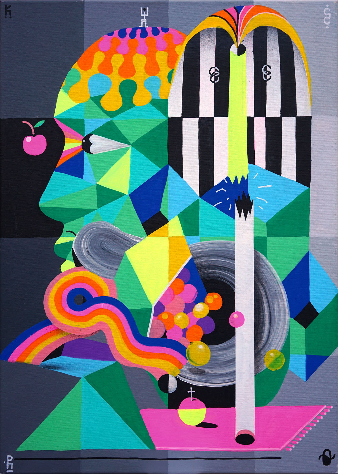 marker, acrilic și vopsea spray pe pânză