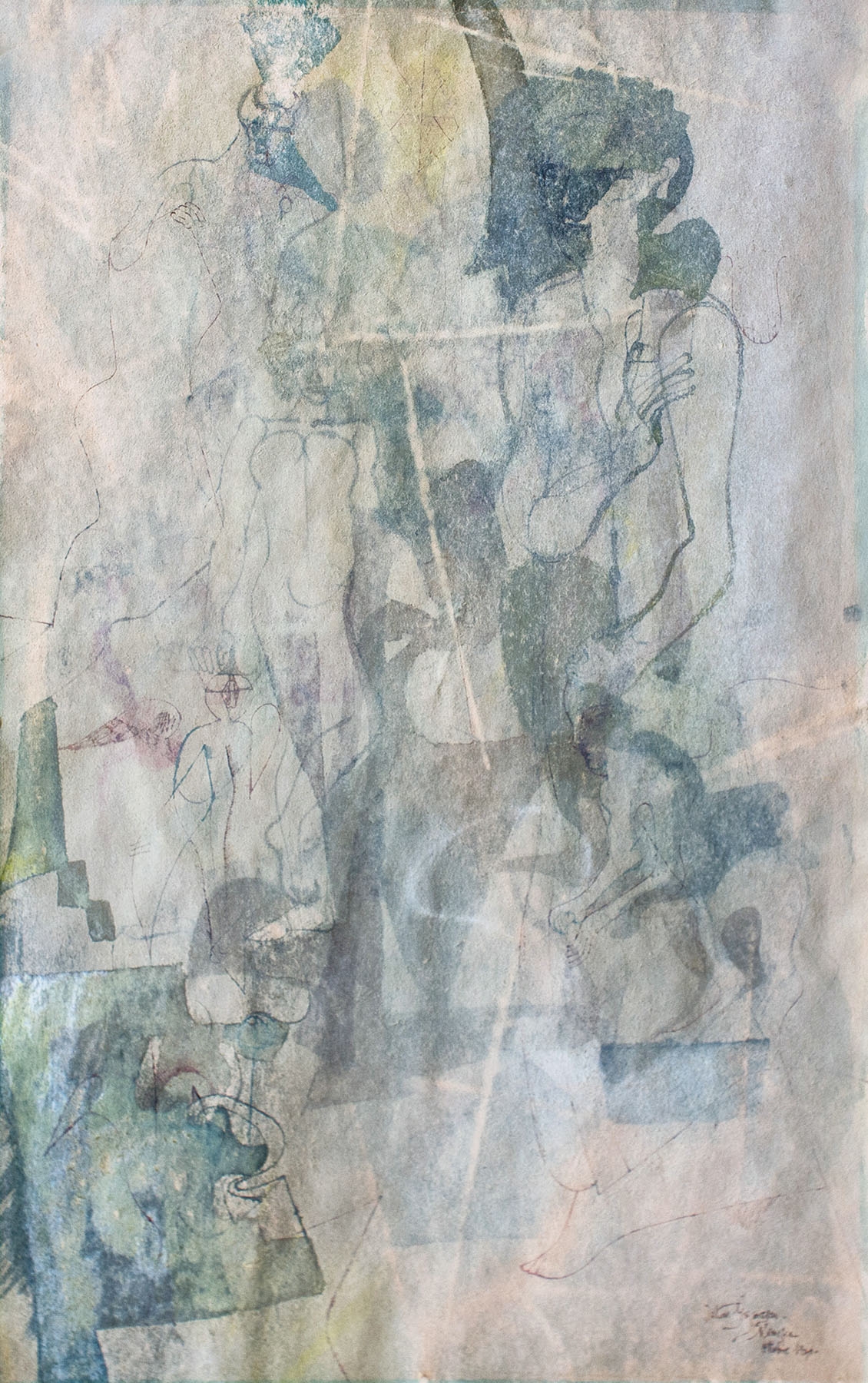 semnat, datat și localizat dreapta jos, în peniță, "Octav Grigorescu, 1970, Veneția"; localizat, datat și intitluat pe verso, cu negru, "Baccho Nascosto, Venezia, 1970",