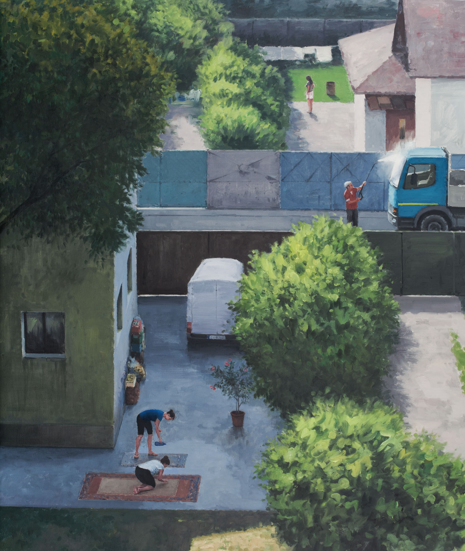 Maturizarea lui Șerban Savu este legată de perioada de tranziție post-comunism, de realitatea socială cotidiană din spațiul românesc post-comunist, de efectele arhitecturale și sociale ale tranziției. Astfel, nu întâmplător, subiectele lui Șerban Savu sunt fundamentate pe motive ale acestei tranziții spre capitalism și democrație. Într-un interviu pentru revista Arta, artistul declara: “Comunismul (sau ce-a fost el) și-a continuat existența în România mult timp după ce a fost declarat în mod oficial mort. În orice caz, nu e asta ceea ce mă interesează, nu Comunismul sau regimul, ci rezultatele lui, efectele unei utopii ratate”. Despre lucrarea “Holy Week” (Săptămâna Mare), artistul declara într-un interviu pentru revista DOR ( a cărei copertă o și ilustrează): “E o privire de ansamblu de pe fereastra atelierului meu, sunt vecinii pe care îi tot spionez – ei neștiind că eu i-am pictat în multe lucrări. Uite, în stânga sunt fiicele familiei, se apropie Paștele și și-au scos covoarele la spălat. Lângă perete sunt tot felul de produse alimentare, sau lăzi de bere. Probabil că în față au un non-stop – niciodată nu m-am uitat, nu trec foarte des pe acolo și nu știu exact care e poarta. Mașina din curte e o mașină de transport. Dar nu știu ce se întâmplă cu adevărat. (…)E evident că au un magazin, i-am văzut periodic că încarcă marfă, cartofi, hârtie igienică. Uite, mi-a plăcut mult relația dintre planta în ghivechi, leandru, și vegetația din jur. Între natural și artificial, sau natura coafată. În alte picturi e mai evidentă relația dintre casa asta și cea din vecini. În urma afacerilor cu non-stopul, au reușit să și-o renoveze, au făcut o curte cu pavaj, gazon pe care îl tund. Dintr-o dată, și-au schimbat viața. Casa asta nu mai e ca la țară, e o casă urbană. Pe peluza asta fac plajă, nu mai pun roșii. Mai au în spate o mică bucată în care mai cresc ceva, au limitat-o. Dar, în vecini, erau niște oameni mai în vârstă, care au lăsat totul cum era înainte, grădina de roșii mult mai mare, curtea nu e pavată – e altă generație. Toată lumea curăță, toată lumea se pregătește de Paște. Evident că scenele astea nu le-am văzut în același timp, le-am mixat. Asta și ținând cont de o anumită rigoare a compoziției pe care am vrut-o. Ce m-a fascinat în imaginea asta e că e o comunitate, fără ca ei să se vadă unul pe celălalt sau să știe unul de celălalt. E un aer comun, deși sunt separați. Lucrează ca albinele într-un fagure. E una dintre viziunile asupra societății care mă interesează: ce face fiecare albinuță acolo.”. Rolul artistului este cel de observator neutru al realității, traducând prin pictură emoții și gânduri. Observația nu este una critică, ci mai degrabă reflexivă întrucât într-o imagine inofensivă se ascunde o realitate complexă, complicată și nuanțată, un puzzle social. Personajele sunt esențiale pentru senzația de real, ele sunt la baza arhitecturii tabloului. Sunt oameni care muncesc zilnic, care își văd de viață, anonimi care alcătuiesc societatea. Într-un interviu acordat cu ocazia expoziției “Daily Practice for the End of the World” și publicat în Dilema Veche, artistul menționa: “Cred că viața zilnică de aici, din Estul Europei, e la fel de interesantă și de plină de savoare ca și viața din New York, din Berlin, la fel de umană și că merită să fie povestită.” (I.S.)