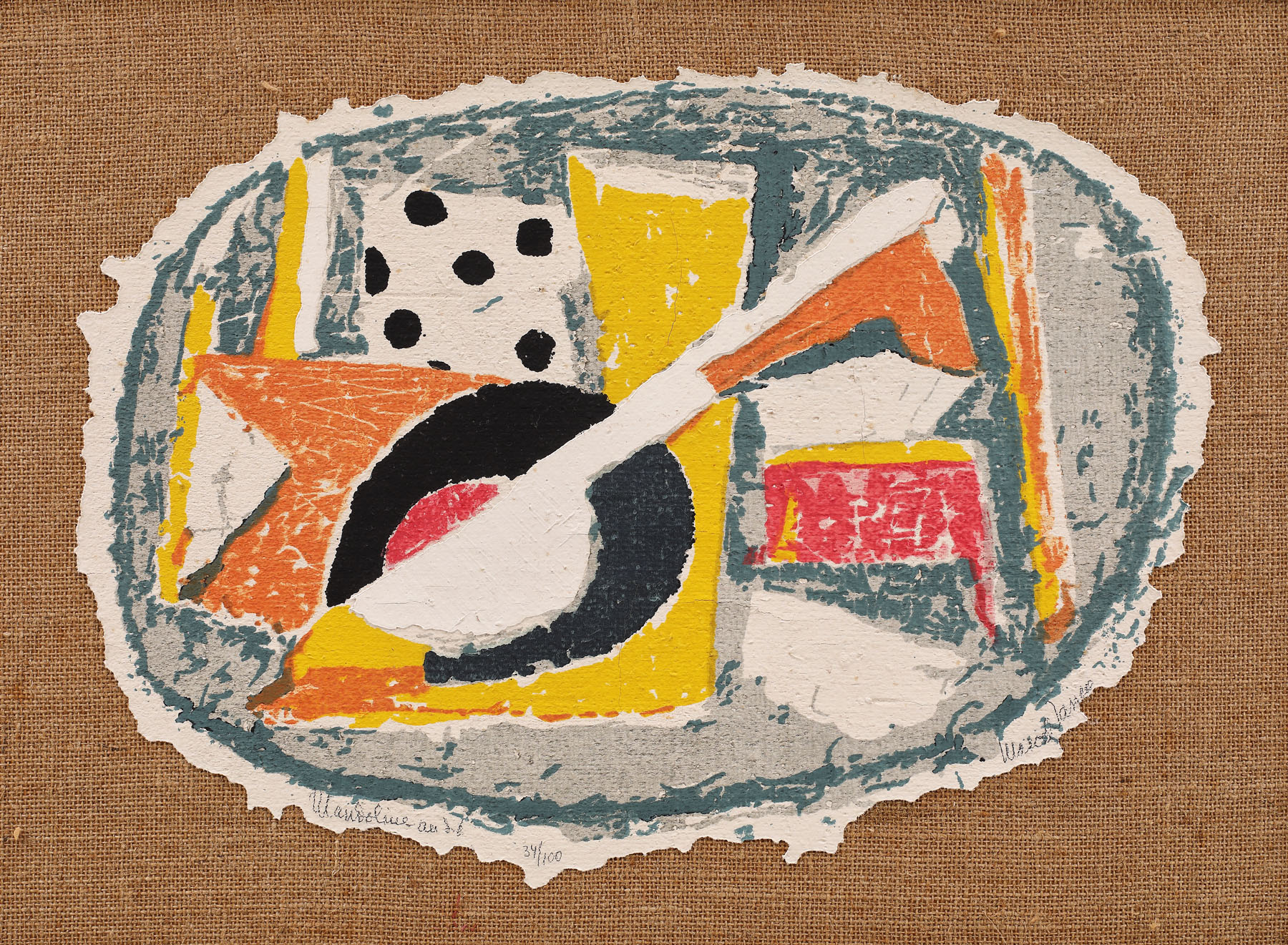 semnat dreapta jos, în creion, "Marcel Janco"; numerotat și intitulat stânga jos, în creion, "Mandoline au dé, 34/100"