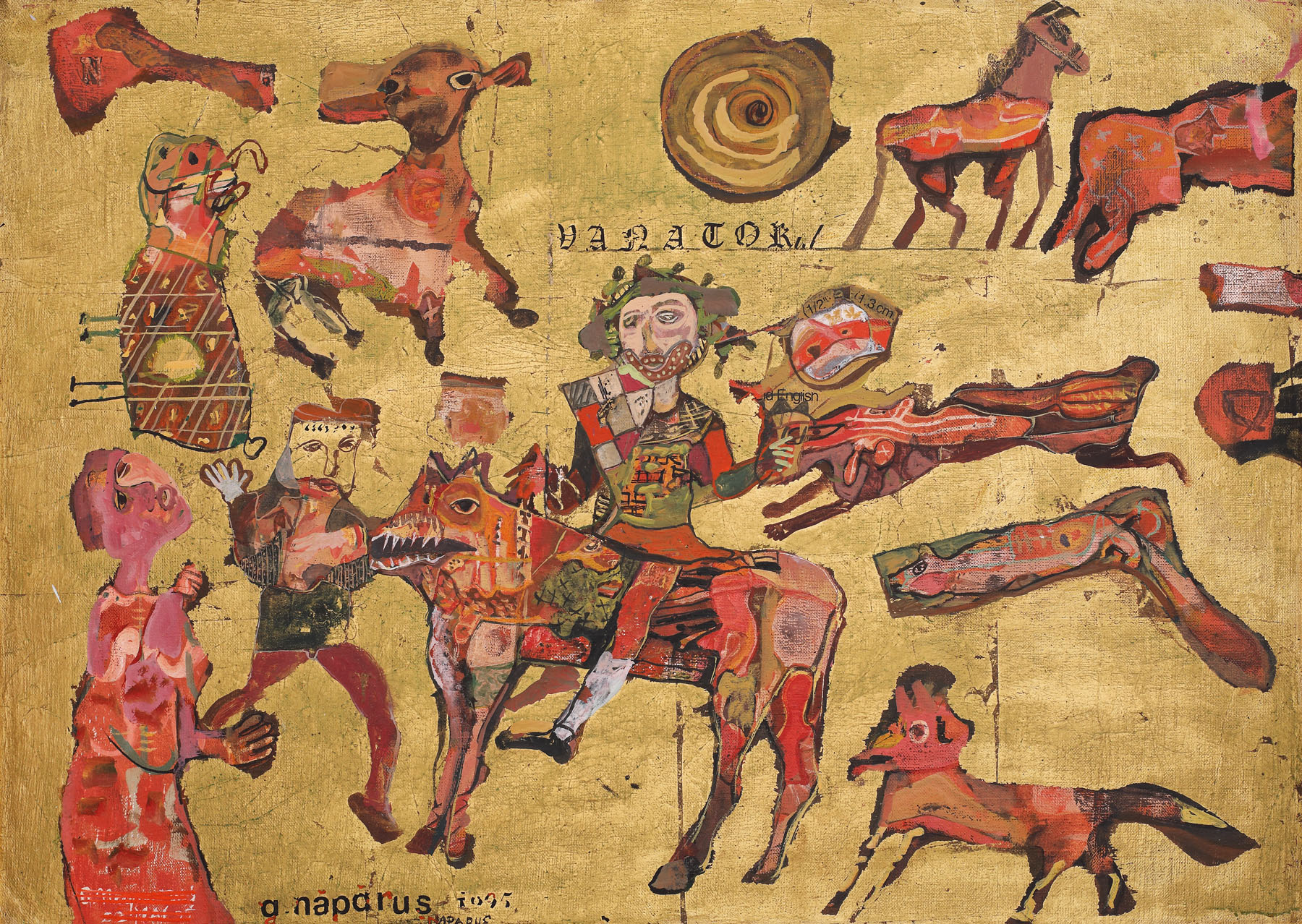 semnat și datat stânga jos, cu negru, "G. Năpăruș, 1995"; semnat și dedicat pe verso, cu roșu, "Vânătorul, G. Năpăruș"