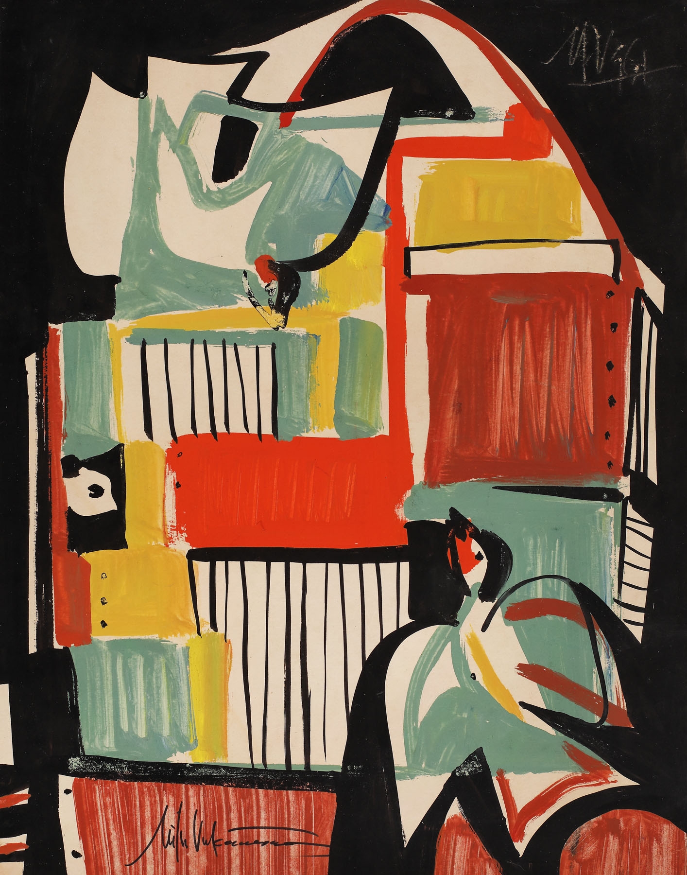 semnat stânga jos, cu negru, "Mihu Vulcănescu"; semnat și datat dreapta sus, cu alb, "MV, (1)961"