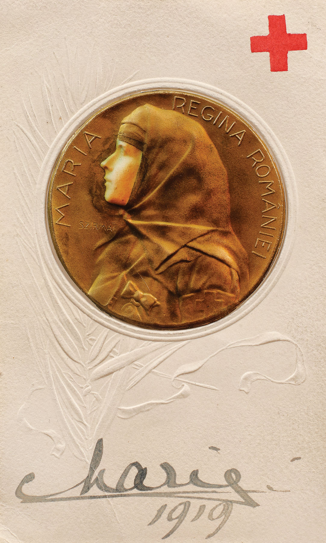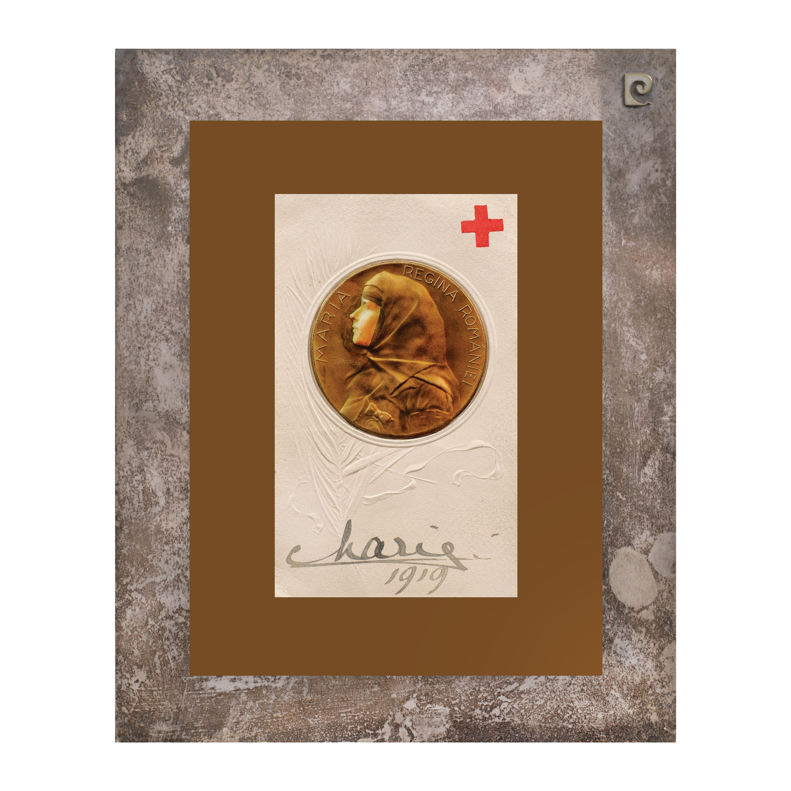 60. Carte poștală a Crucii Roșii Române, ilustrând-o pe Regina Maria în uniforma asociației, având ca scop obţinerea de fonduri pentru ajutorarea răniţilor de război, 1919, cu semnătura olografă a reginei, în ramă din argint, atelier Pierre Cardin, piesă de colecție