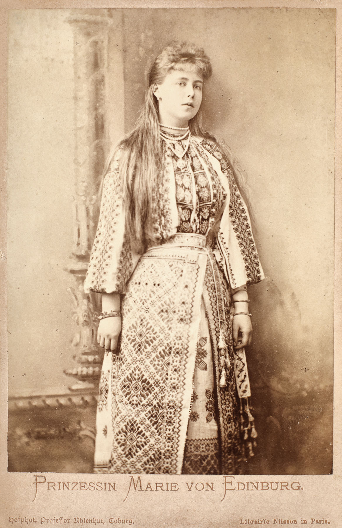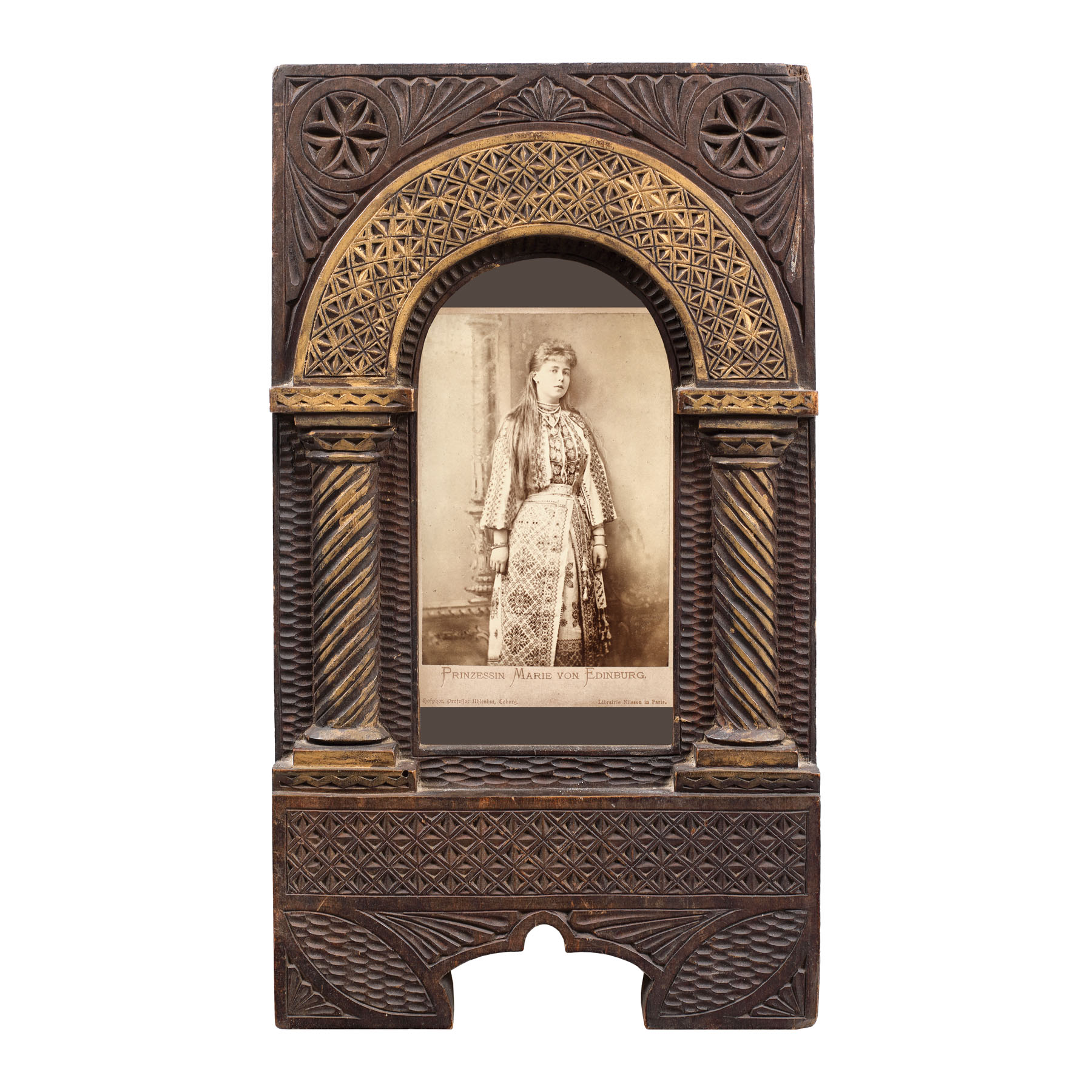 58. Fotografie ilustrând-o pe Principesa Maria în costum popular, cca. 1890, în ramă decorată cu motive Neo-brâncovenești