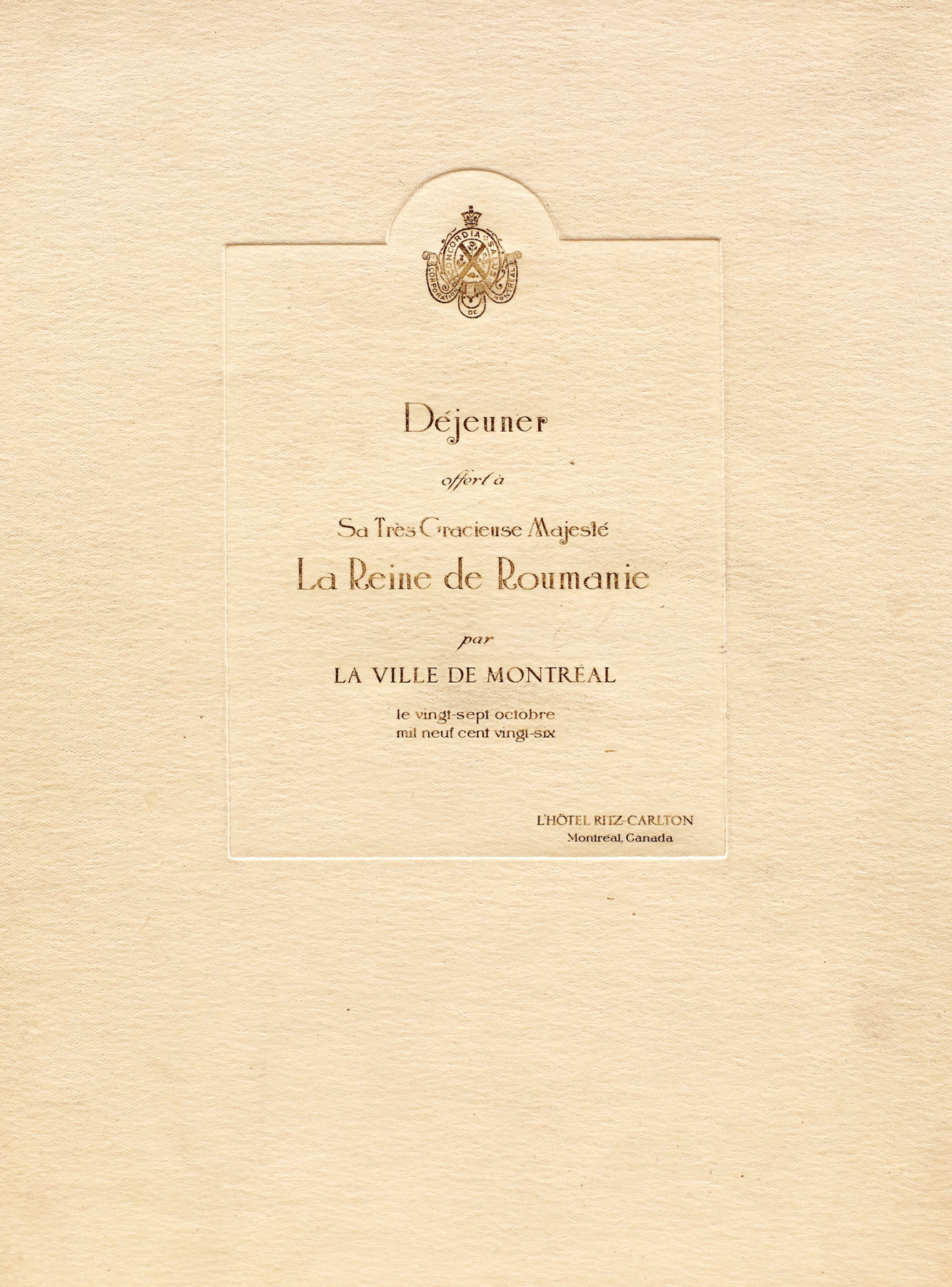 64. Meniu al unui dineu dat în cinstea Reginei Maria la Hotelul Ritz-Carlton, Montreal, 27 octombrie 1926
