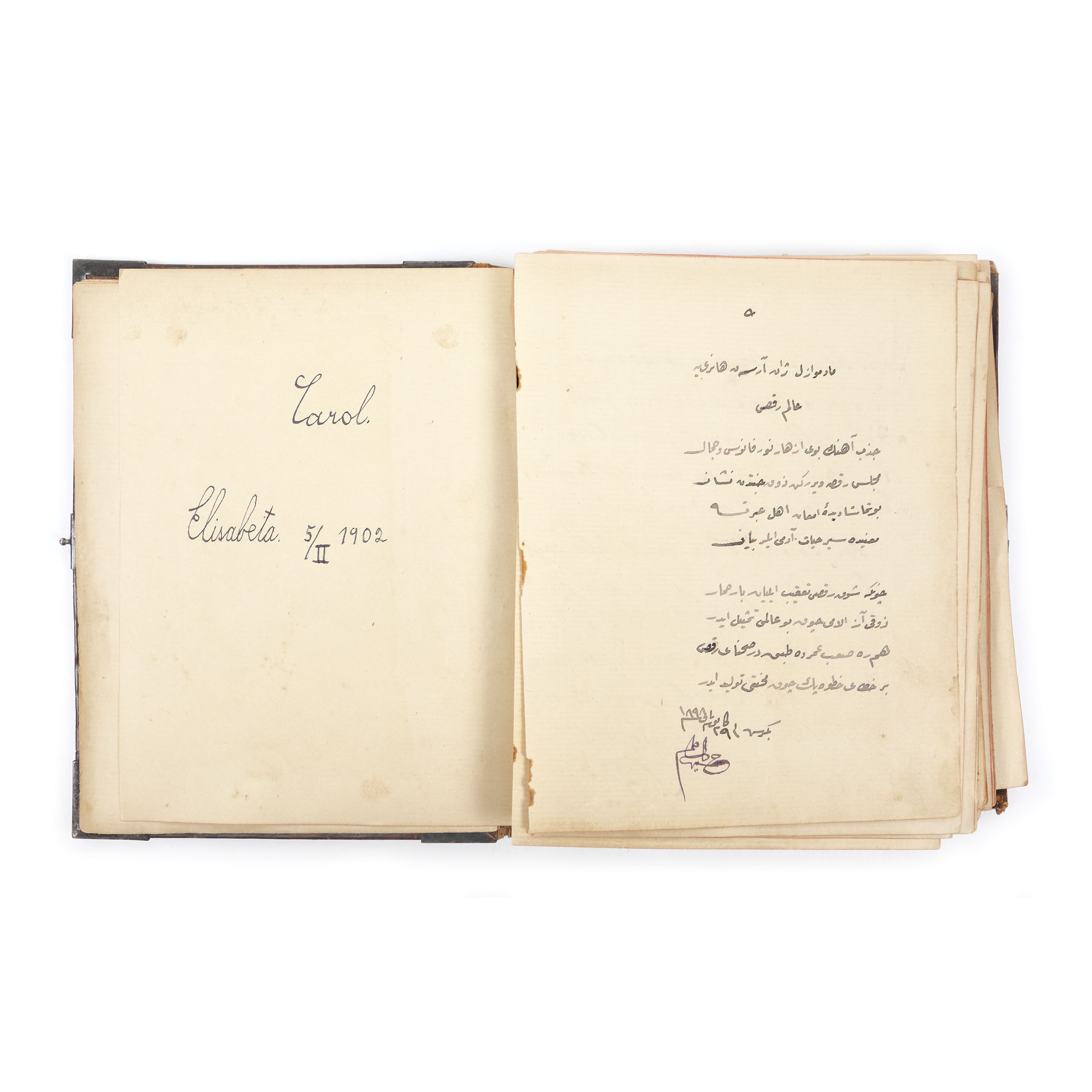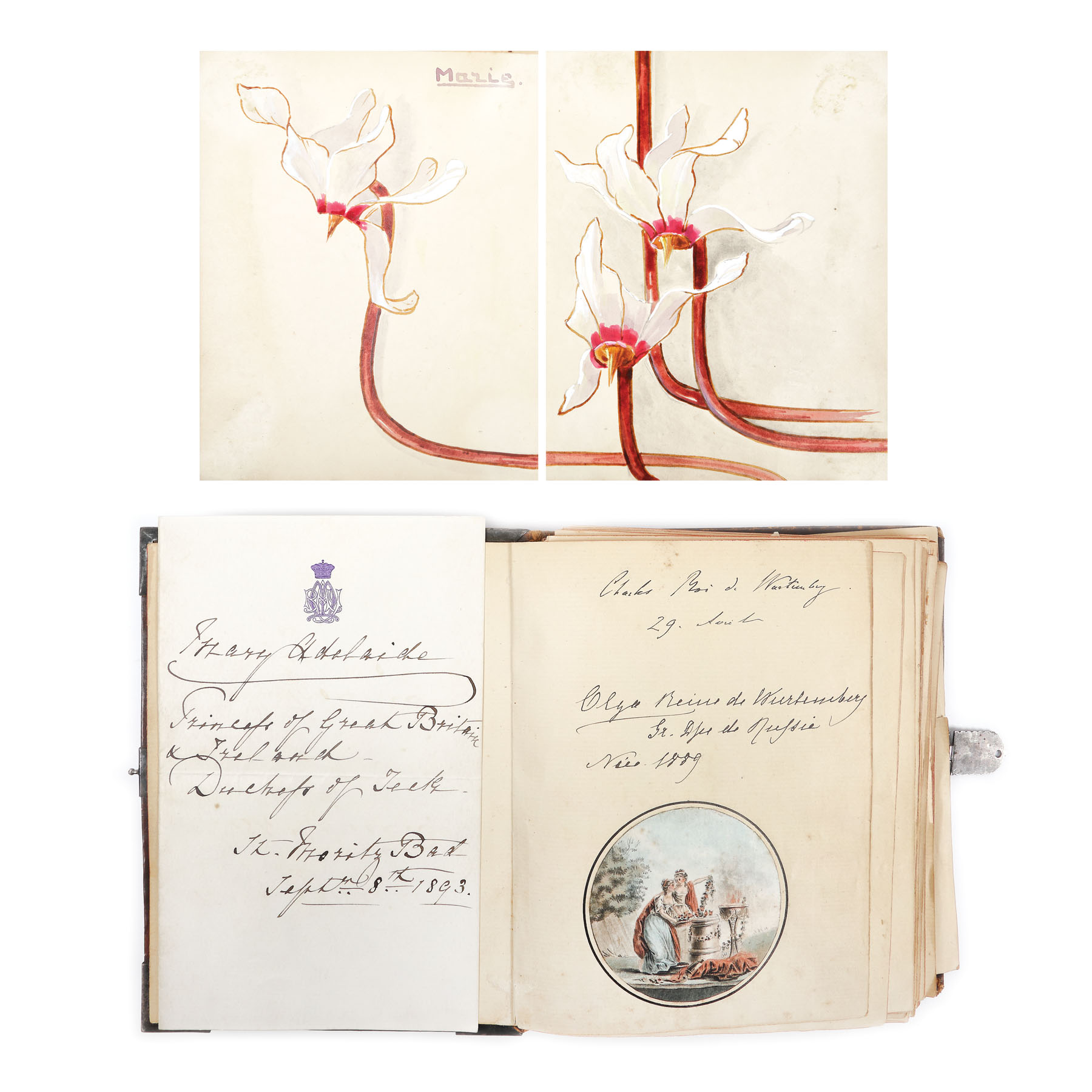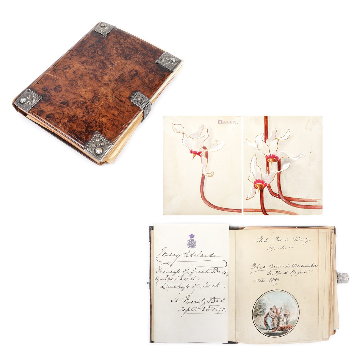 67. Oracol inaugurat la 1889 de Regele Karl al Württembergului și de Regina Olga, născută Mare Ducesă a Rusiei, mătușă a Reginei Mariei, cu semnăturile olografe ale Reginei Maria, Regelui Carol I, Reginei Elisabeta, o acuarelă de Regina Maria, un desen realizat de prințul Carol al II-lea (copil) și un desen realizat de Principesa Elisabeta (fiica Reginei Maria), raritate absolută, de colecție