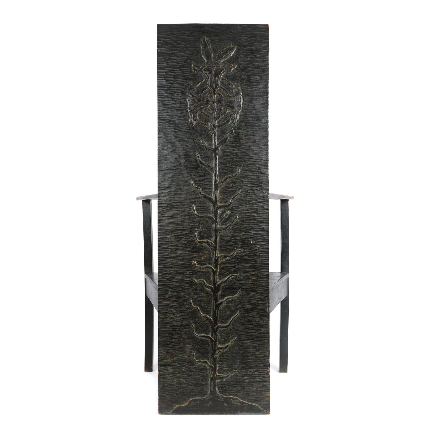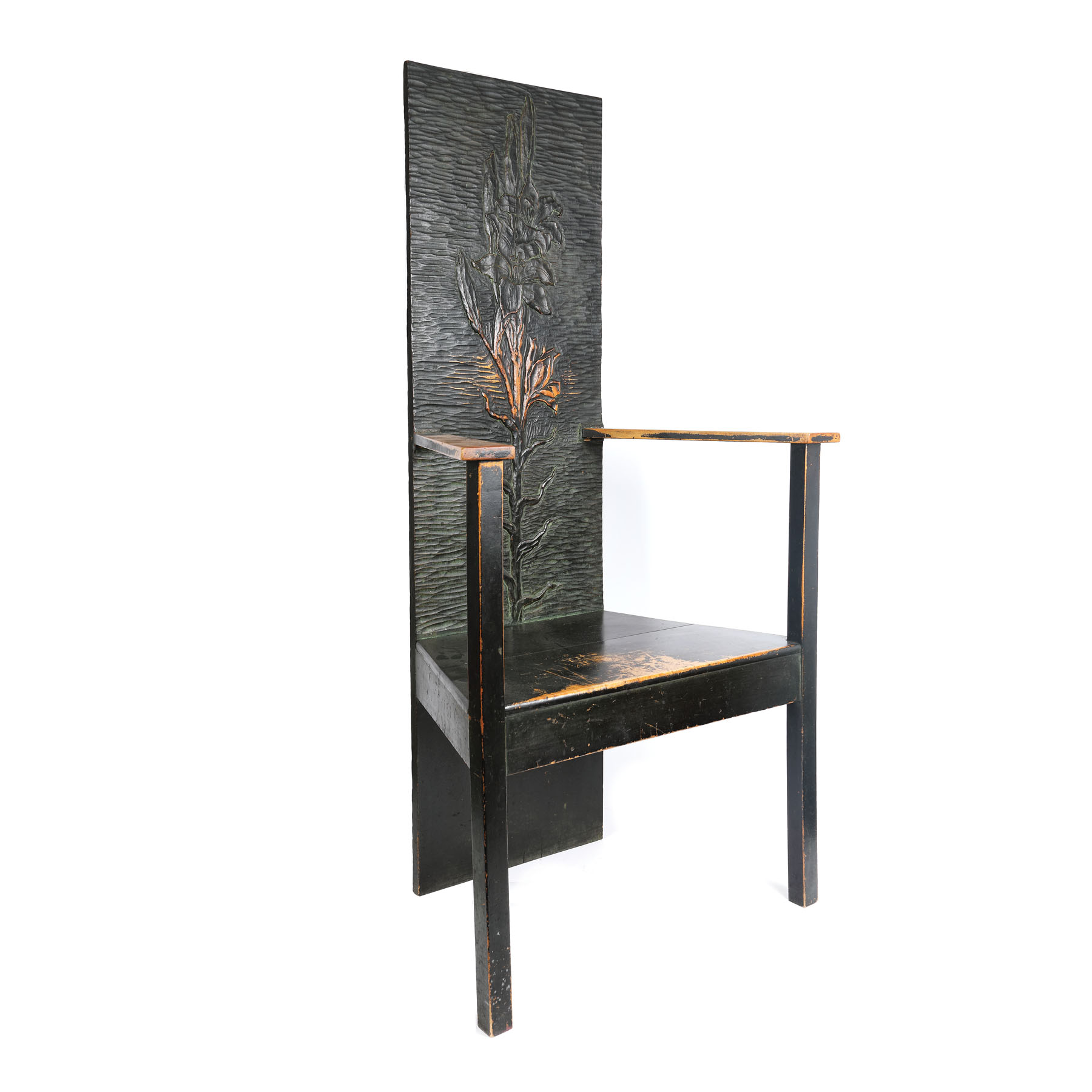 48. Scaun "Lily chair", din lemn masiv sculptat manual, Art Nouveau românesc, decorat cu crini, realizat în Atelierele Școlii de la Sinaia, designer Principesa Maria, cca. 1910, a aparținut familiei Radivon, piesă rară, de colecție