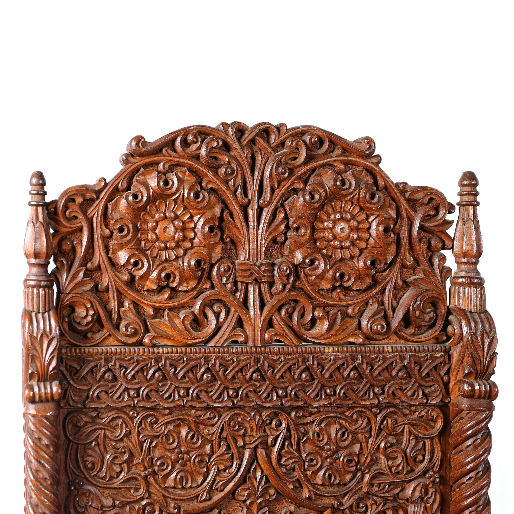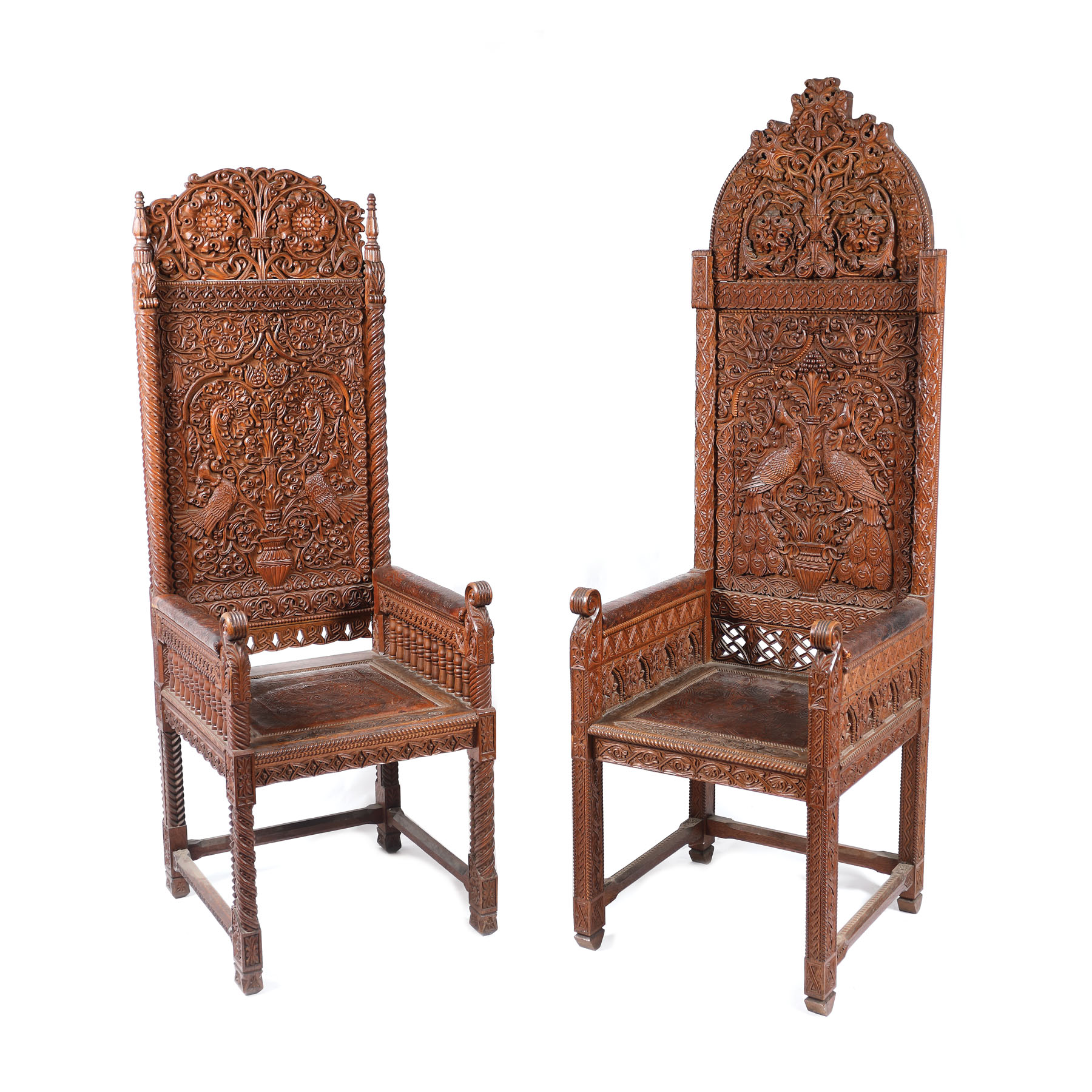 49. Superbă pereche de jilțuri domnești, realizate în stil Neo-Românesc, decorate cu păuni în grădina paradisului, sfârşitul sec. XIX