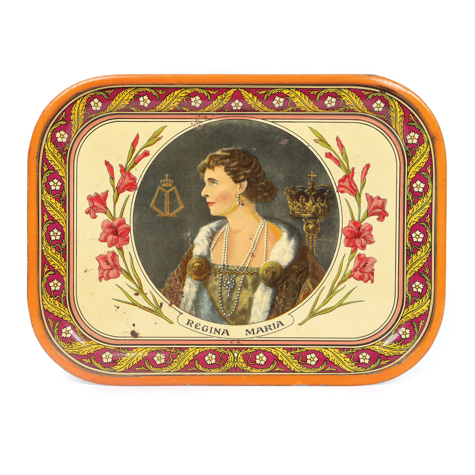 80. Tavă decorată cu efigia Reginei Maria și cu flori de iris, cca. 1922