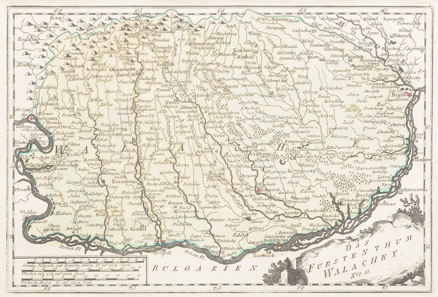 Cartograful și editorul vienez Franz Johann Joseph von Reilly (1766-1820) s-a remarcat în special prin publicarea a două lucrări, "Scena celor cinci părți ale lumii" și "Marele atlas german". Piesa de față, parte a Scenei, cuprinde Muntenia propriu-zisă, delimitată de Carpați și Dunăre, cu marcarea principalelor cursuri de apă, a formelor de relief și a toponimelor. În partea stângă jos găsim scara exprimată în diferite unități, iar în partea dreaptă jos, se află titlul planșei și numărul din atlas.
