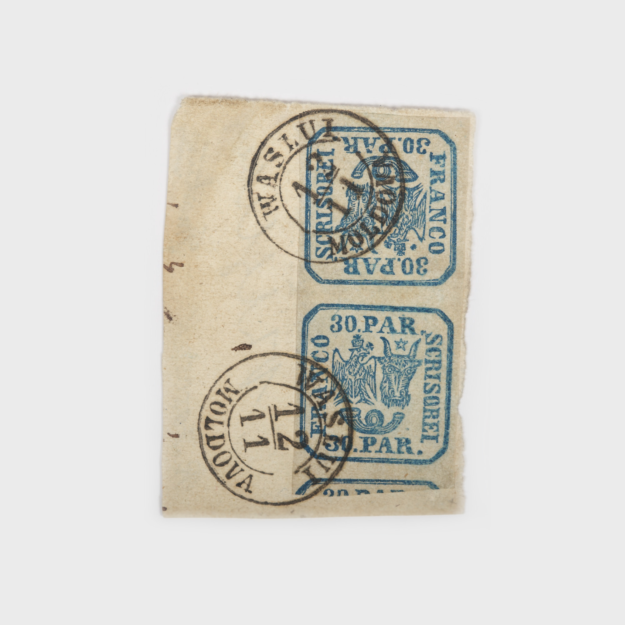 Piesă rară de colecție filatelică, conținând un fragment de scrisoare, francat cu o pereche verticală de timbre ”Principatele Unite” de 30 de parale. Piesa este semnată pe verso de expertul R. Zoscsak, baronul J. W. von Witzleben - mare colecționar român de origine germană a cărui colecție a fost confiscată de ruși ca pradă de război în 1945 - dar și de George Matheescu - primar al orașului Sinaia, mare colecționar interbelic și prieten cu Carol II.
