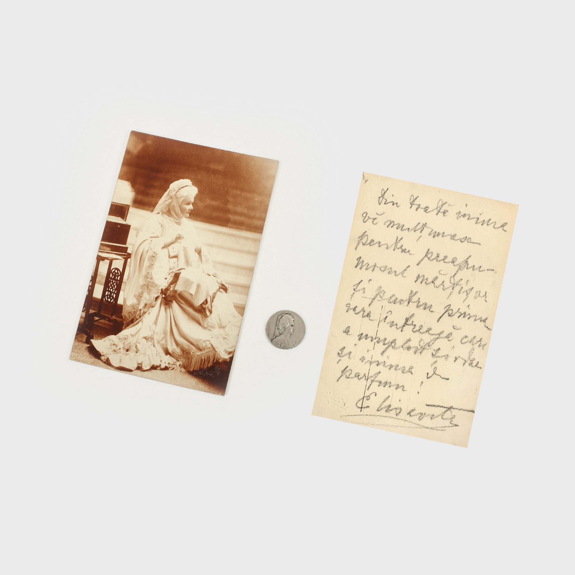 139. Lot format dintr-un mărţişor și o fotografie reprezentând-o pe Regina Elisabeta, purtând gândurile de mulțumire și semnătura olografă ale acesteia