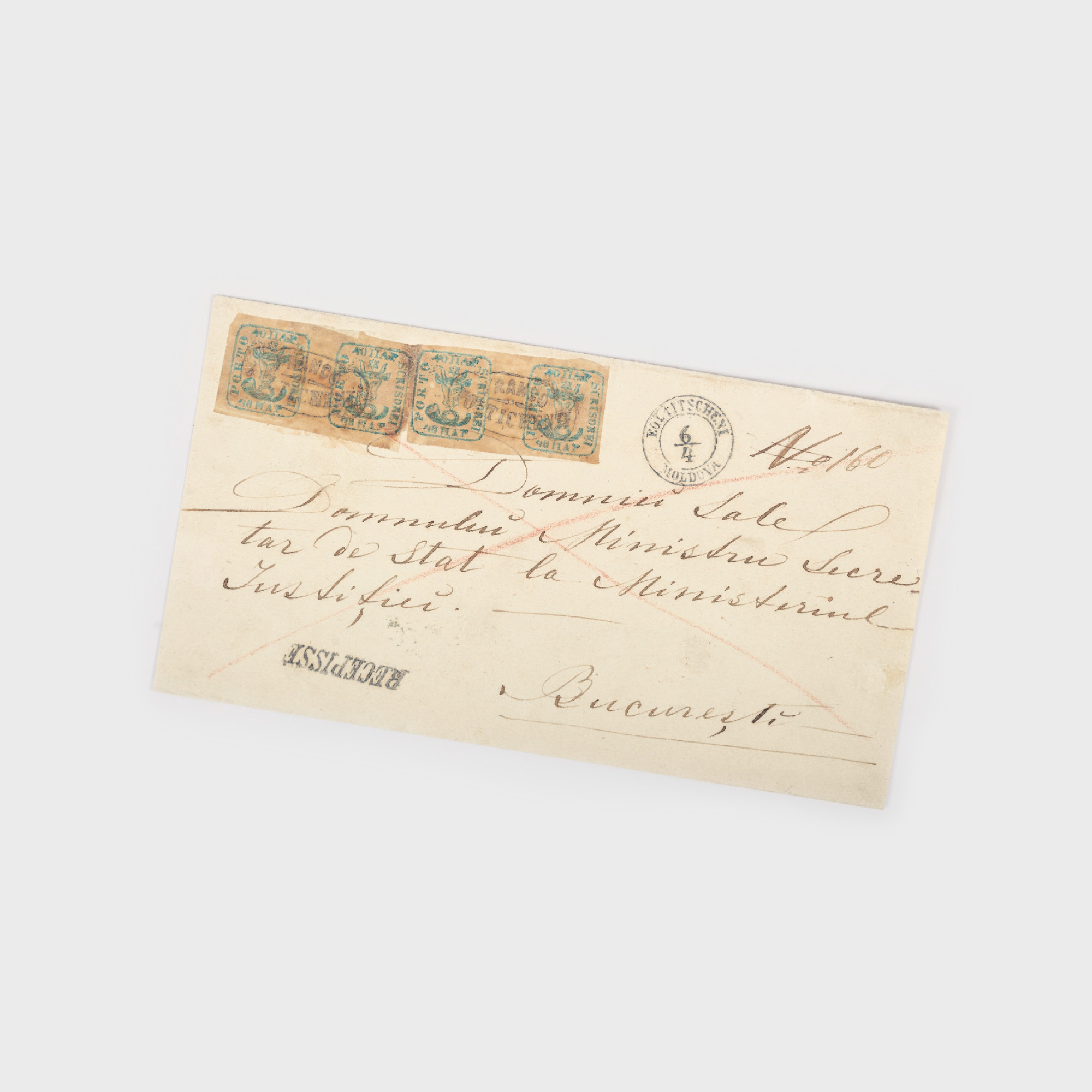 Piesa de față reprezintă o raritate, întrucât este o scrisoare recomandată întreagă cu cele patru timbre Cap de bour de 40 de parale încă intacte. Timbrele Cap de Bour de 40 de parale au fost puse în circulație la data de 1 noiembrie 1858 și fac parte din al doilea tiraj de timbre emise în Principatele Române. Această a doua emisiune a fost tipărită odată cu introducerea tarifului poștal unic și după următoarele valori: 5 parale, 40 de parale şi 80 de parale. Timbrele sunt obliterate câte două cu ștampilă ”B3 Franco-Foltichenii”, ștampilă ”Foltichenii 6/4 Moldova”, expediată la București cu sosire ”Bucaresti” 12/4. Scrisoarea este cu atât mai specială cu cât este adresată ”Domniei Sale, Domnului Ministru, Secretar de Stat la Ministerul Justiției”.