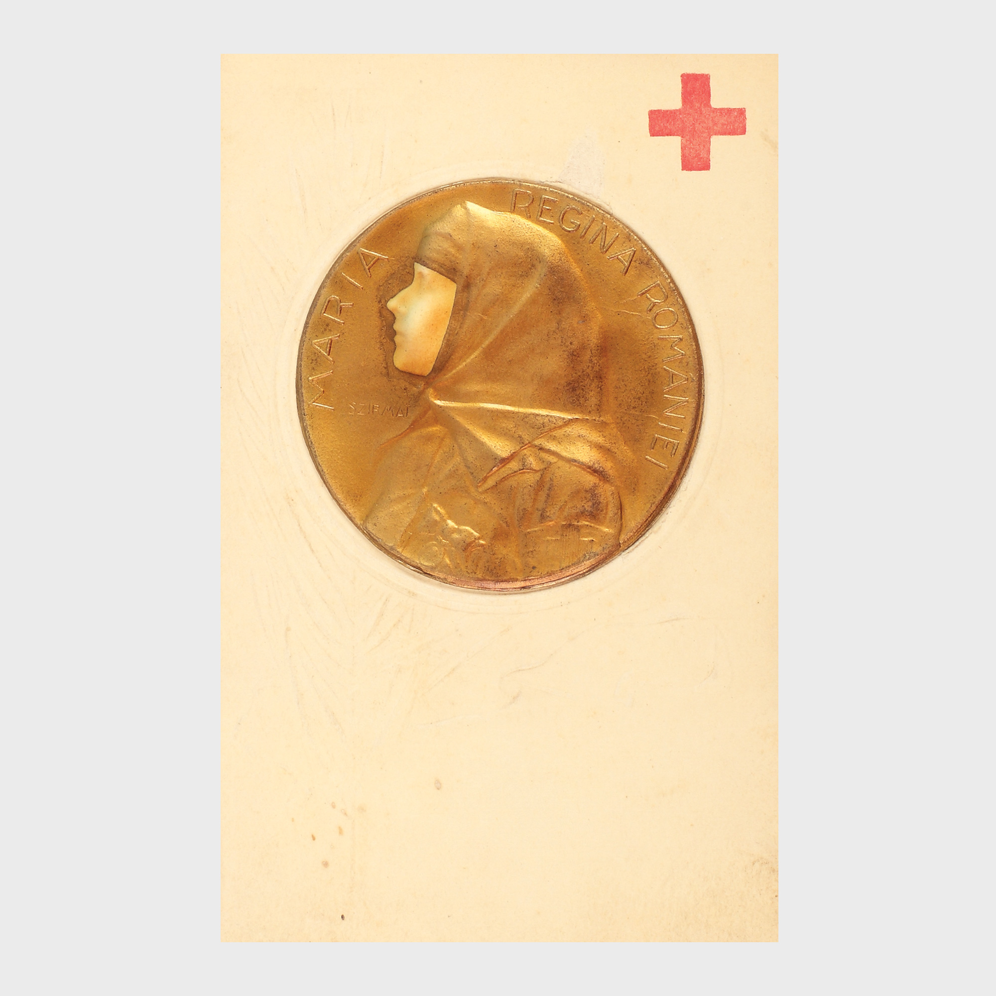 Cartea poștală este una deosebită, tipărită în Franța din inițiativa Reginei Maria care încerca, prin vânzarea tirajului, să obțină fonduri pentru ajutorarea răniților de război. Portretul reginei înveșmântată în uniforma Crucii Roșii este imprimat în zinc și aplicat pe fiecare exemplar.