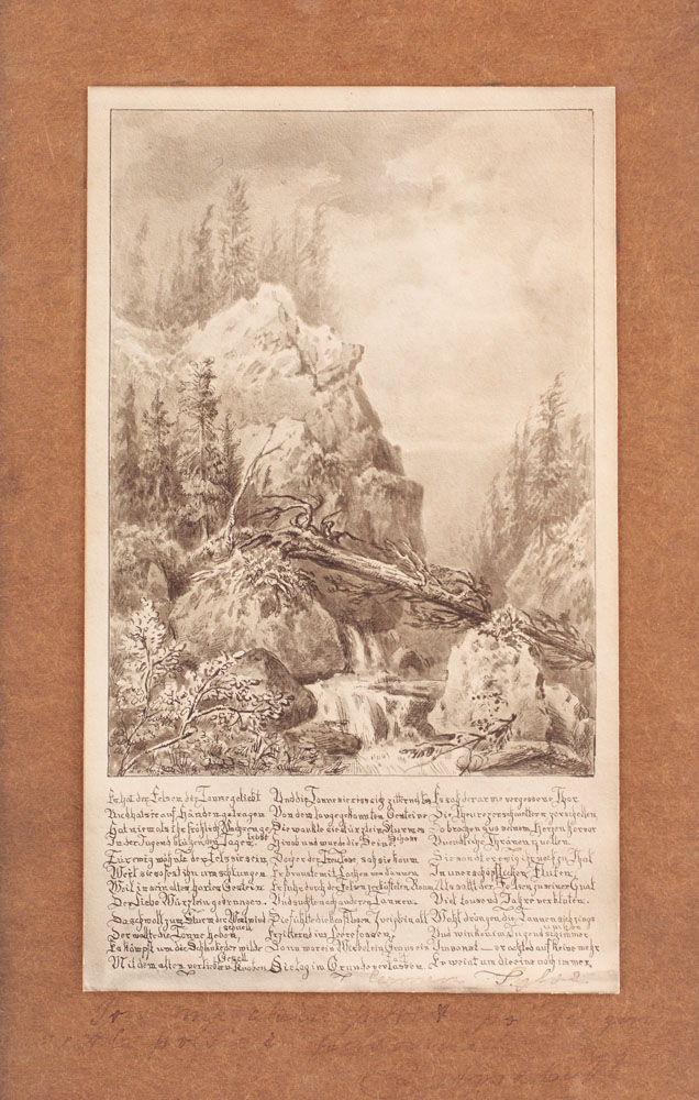 Desenul în tuș și laviu are ca temă cele trei strofe scrise de regina Elisabeta care le și semnează în colțul din dreapta al lucrării, folosind pseudonimul său literar, Carmen Sylva. Un colț de munte văzut după ce norii furtunii s-au împrăștiat, iar lumina discretă încă ne arată un copac prăbușit peste un fir de apă. Pe paspartu, în partea inferioară, regina a adăugat la un moment dat o dedicație olografă: Pour ma chère petite poupée qui est la poésie de ma personne. Elisabeth". Dedicația ne face să credem că regina îi dedica această frumoasă lucrare chiar nepoatei sale, principesa Maria, a doua fiică a cuplului Ferdinand și Maria, care avea în 1906 șase ani, puțin mai mult decât propria fiică, cu același nume, răpusă de scarlatină la vârsta de patru ani.