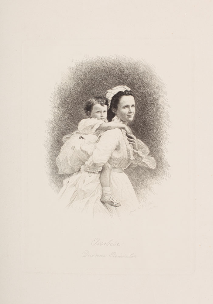 Splendida gravură, realizată de Constantin D. Stahi la Munchen în 1877, după o fotografie de Carol Pop de Szathmari, o înfățișează pe viitoarea regină Elisabeta împreună cu unicul copil, principesa Mărioara (1870-1874), răpusă la o vârstă fracedă, de scarlatină. Pictorul C.D. Stahi a practicat cu succes gravura și xilogravura, mărturie stând și piesa de față.