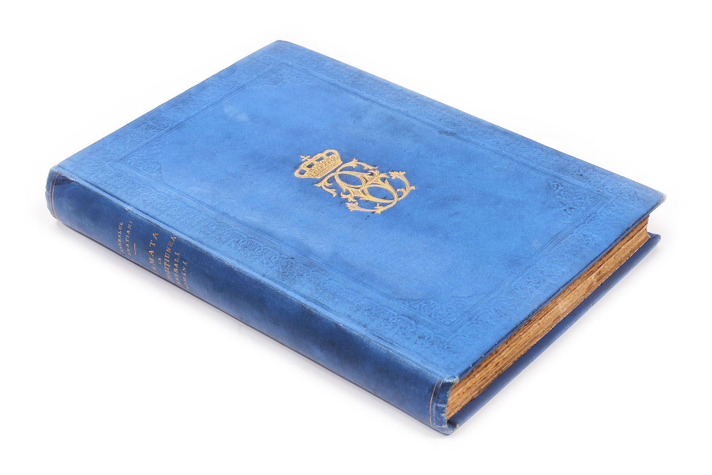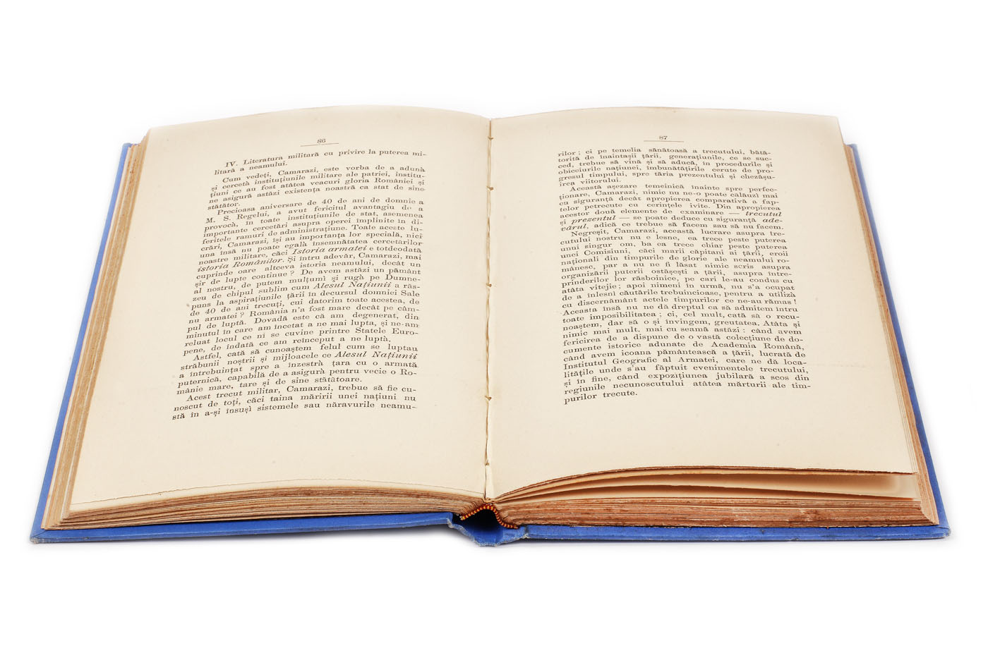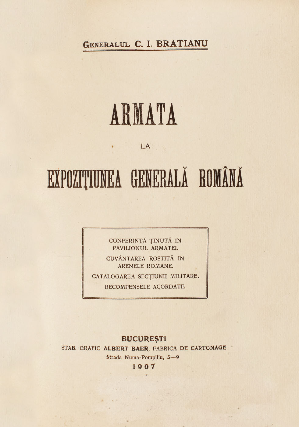60. "Armata la Expozițiunea Generală Română" de generalul C.I. Brătianu, având pe copertă cifrul aurit al Regelui Carol I, București, 1907