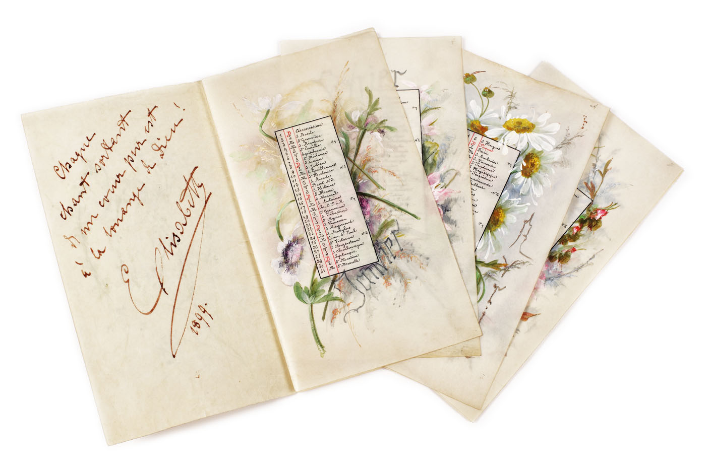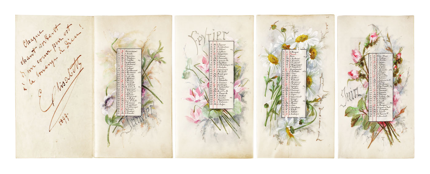 Calendarul anului 1899 cuprinde 8 file pictate cu buchețele de flori, diferite pentru fiecare lună. Realizat în chip de carnețel, debutează cu o primă pagină de titlu, decorată cu flori de câmp, anturând cifra anului 1899; pe interior conține un panseu al Reginei, olograf și autografiat, în limba franceză: "Chaque chant sortant de mon coeur pur est à la louange de Dieu!" (Fiecare cântec ce vine din inima mea curată este o laudă lui Dumnezeu!). Fiecare pagină a calendarului este pictată în guașă, reprezentând motive florale specifice, cu larghețe, anotimpului lunii descrise. În cartuş, calendarul indică, cu culoarea roșie, zilele de sărbătoare. Ziua de 14 iulie este însemnată, ca și omagiu al Zilei Naţionale a Franței.