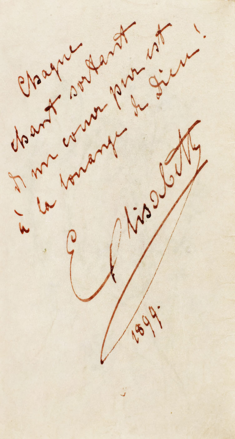 semnat, datat şi notat în tuș, "Elisabette, 1899, Chaque chant sortant de mon coeur pur est à la louange de Dieu!"