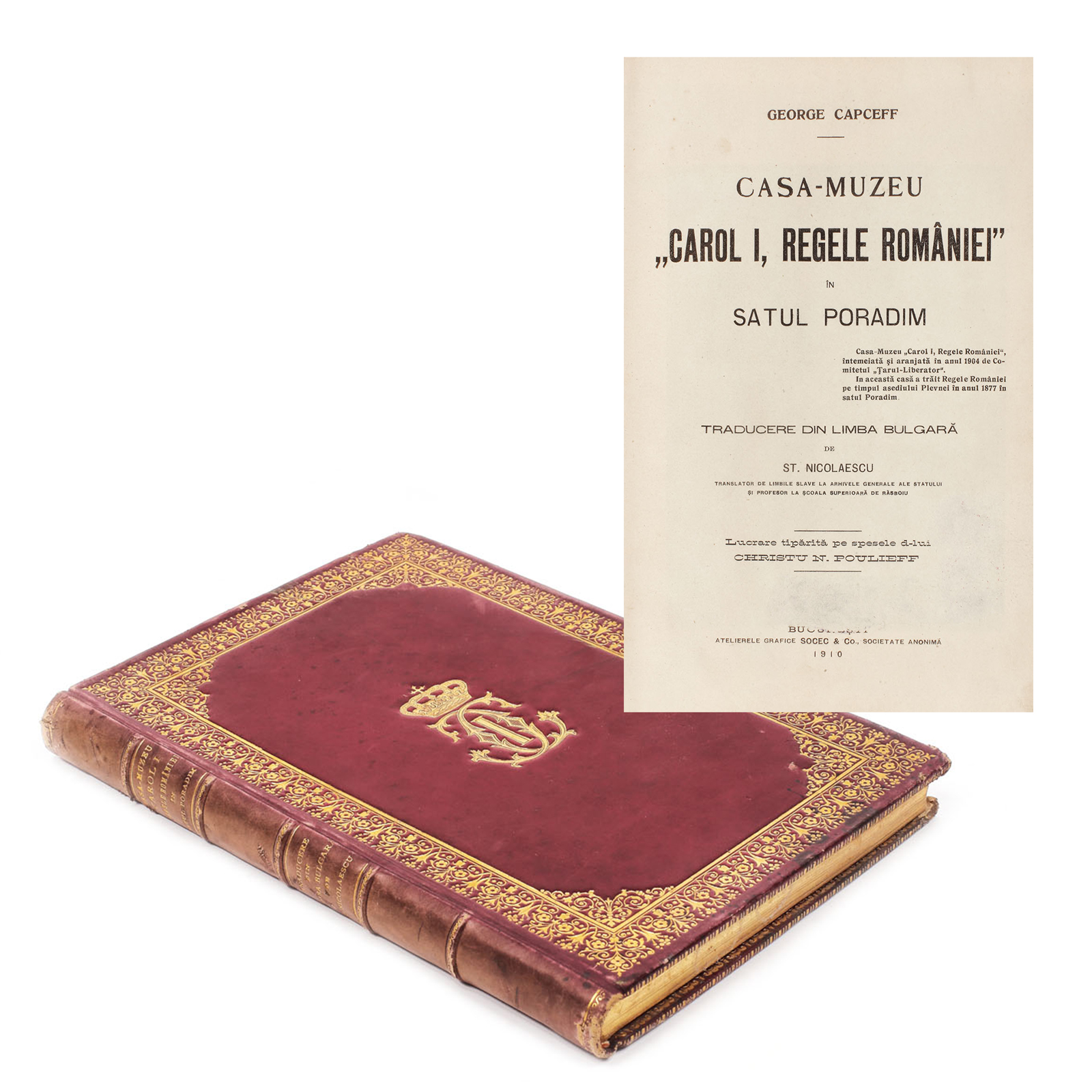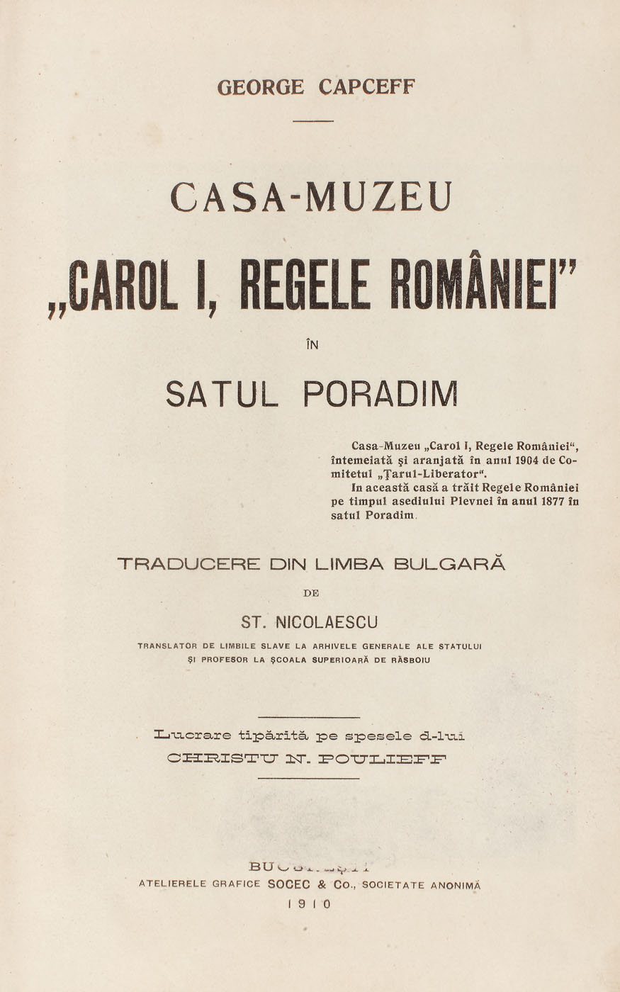 70. "Casa - Muzeu Carol I, Regele României în satul Poradim", traducere din bulgară de George Capceff, București, cu cifrul aurit al Regelui Carol I, 1910