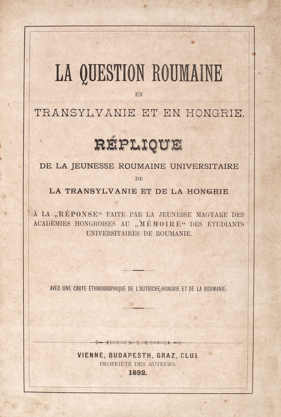 75. "Chestiunea română în Transilvania şi Ungaria", franceză, Viena, Budapesta, Graz, Cluj, 1892