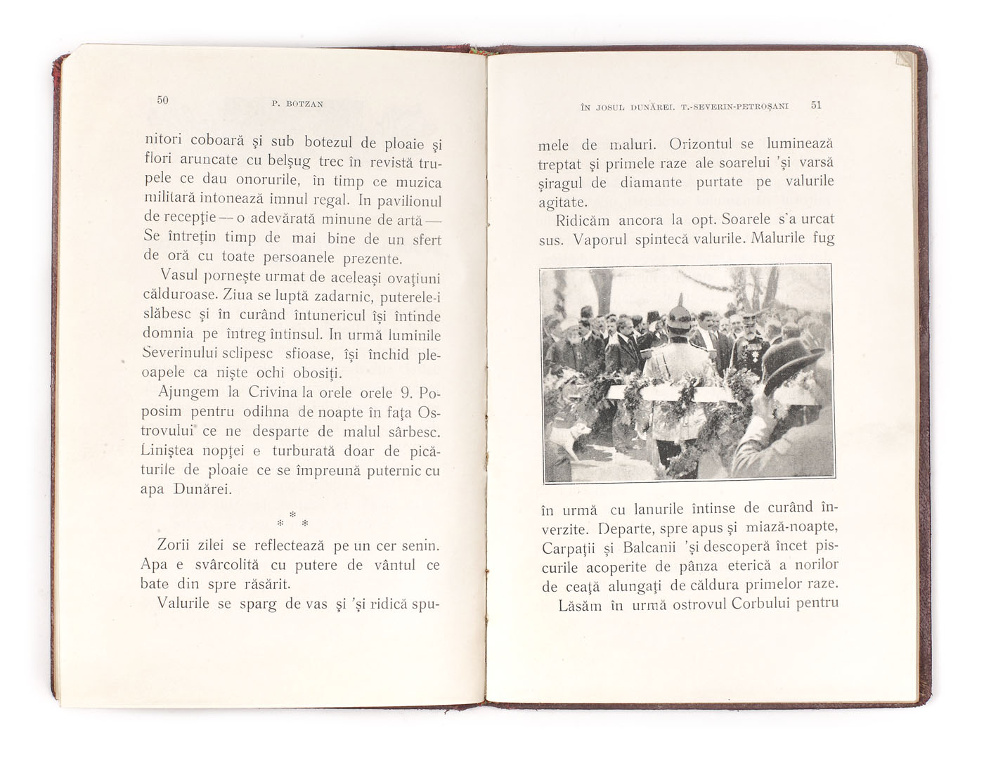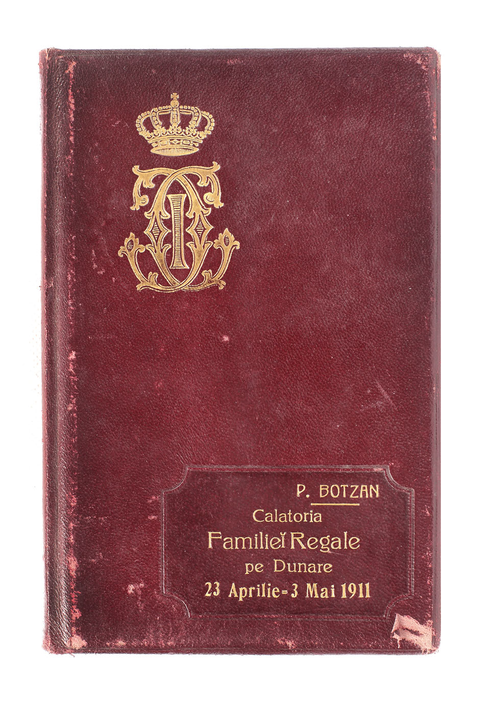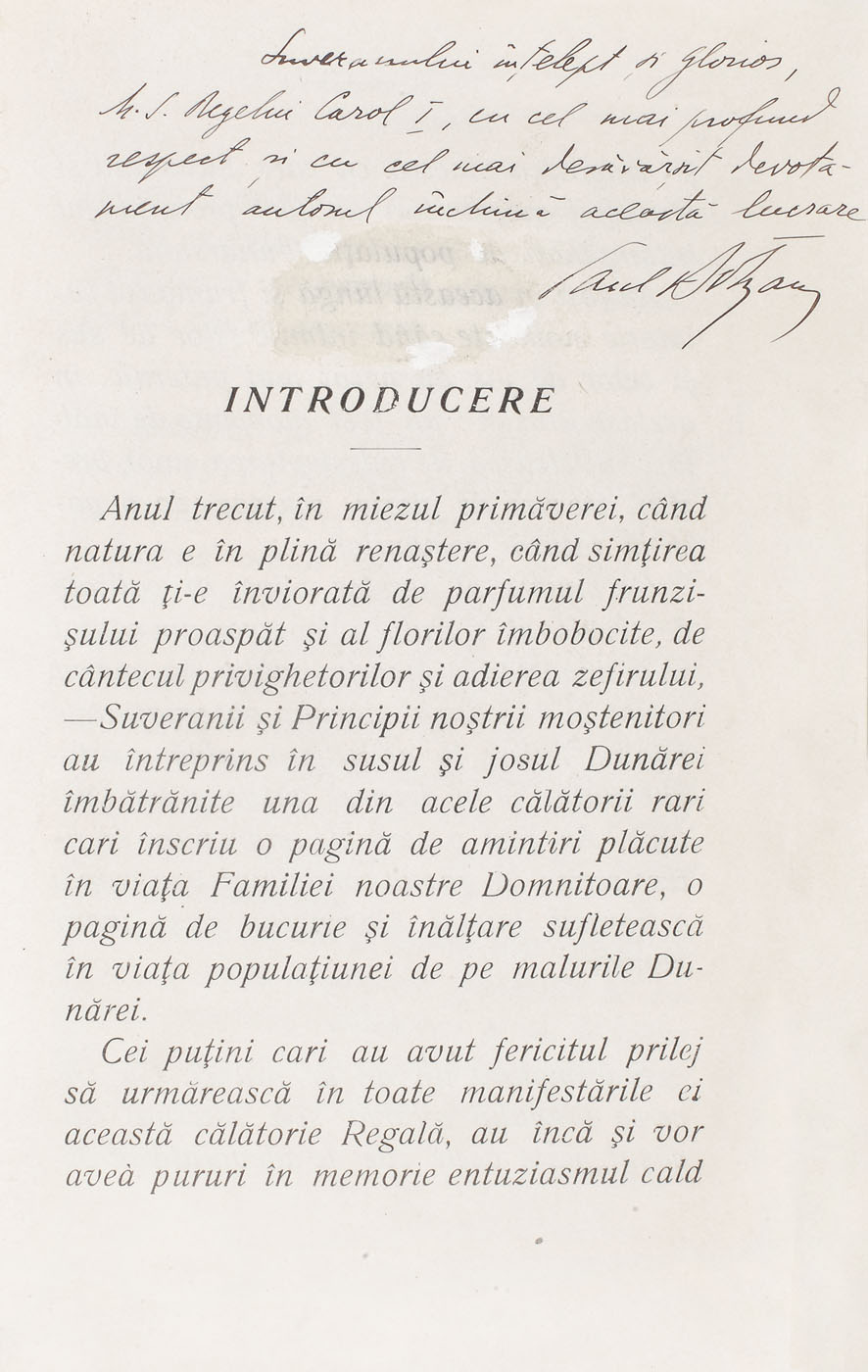 69. "Pe Dunăre - Călătoria Familiei Regale în susul şi în josul Dunărei 23 Aprilie - 3 Mai 1911", de P. Botzan, Bucureşti, 1912, conține dedicația autorului către Regele Carol I, este legat în piele, cu cifrul aurit al Regelui Carol I.