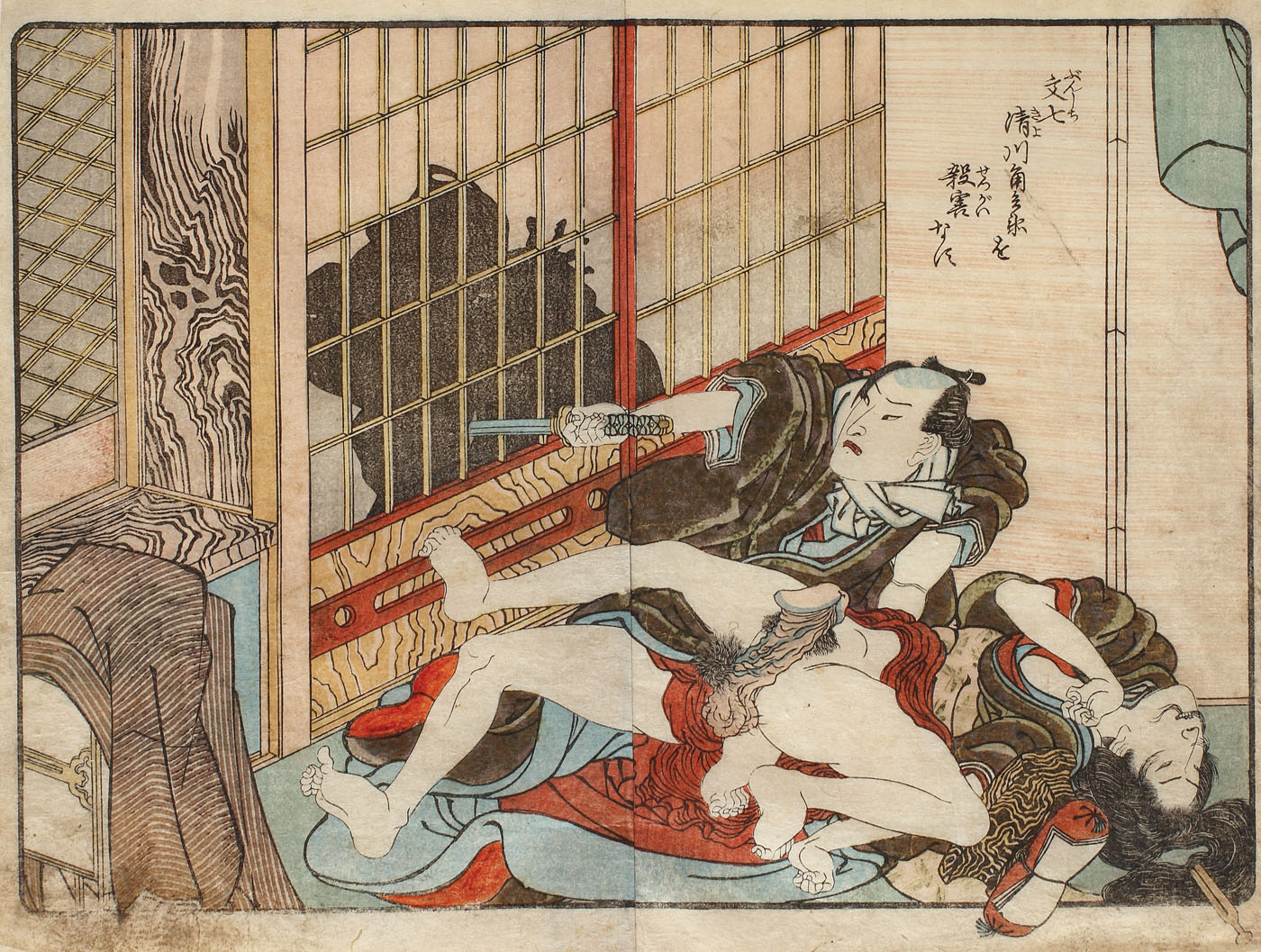 384. Scenă erotică (Shunga), cu un tânăr înjunghiind o umbră misterioasă în timp ce iubita acestuia este în extaz, cca. 1825