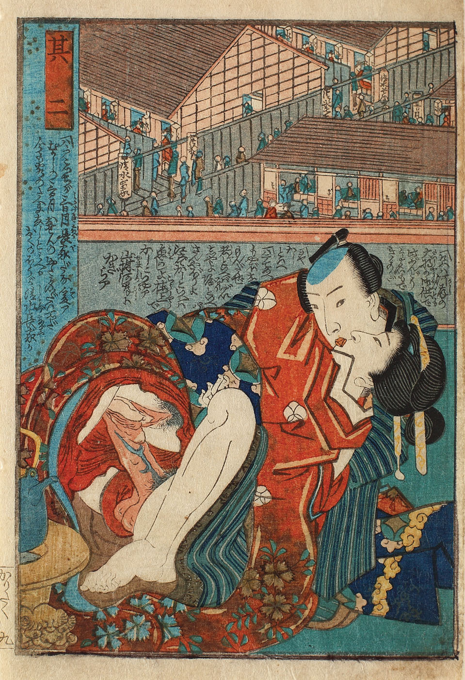 398. Scenă erotică (Shunga), reprezentând un cuplu într-un spaţiu urban, departe de ochii lumii, cca. 1845-1850