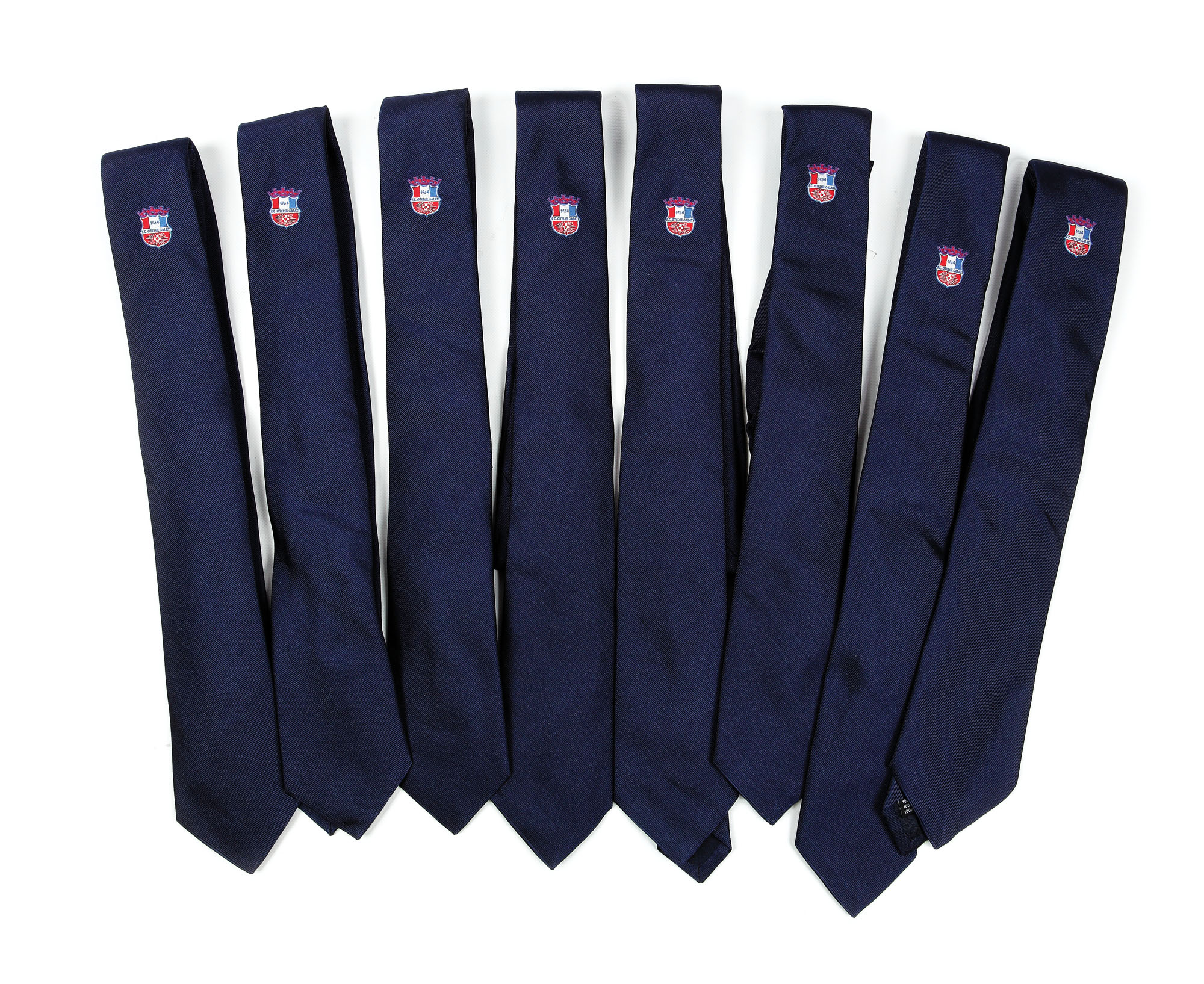 42. Lot de 8 cravate inscripționate cu sigla FC Oțelul Galați, parte a uniformei oficiale a fotbaliștilor în deplasările din Champions League