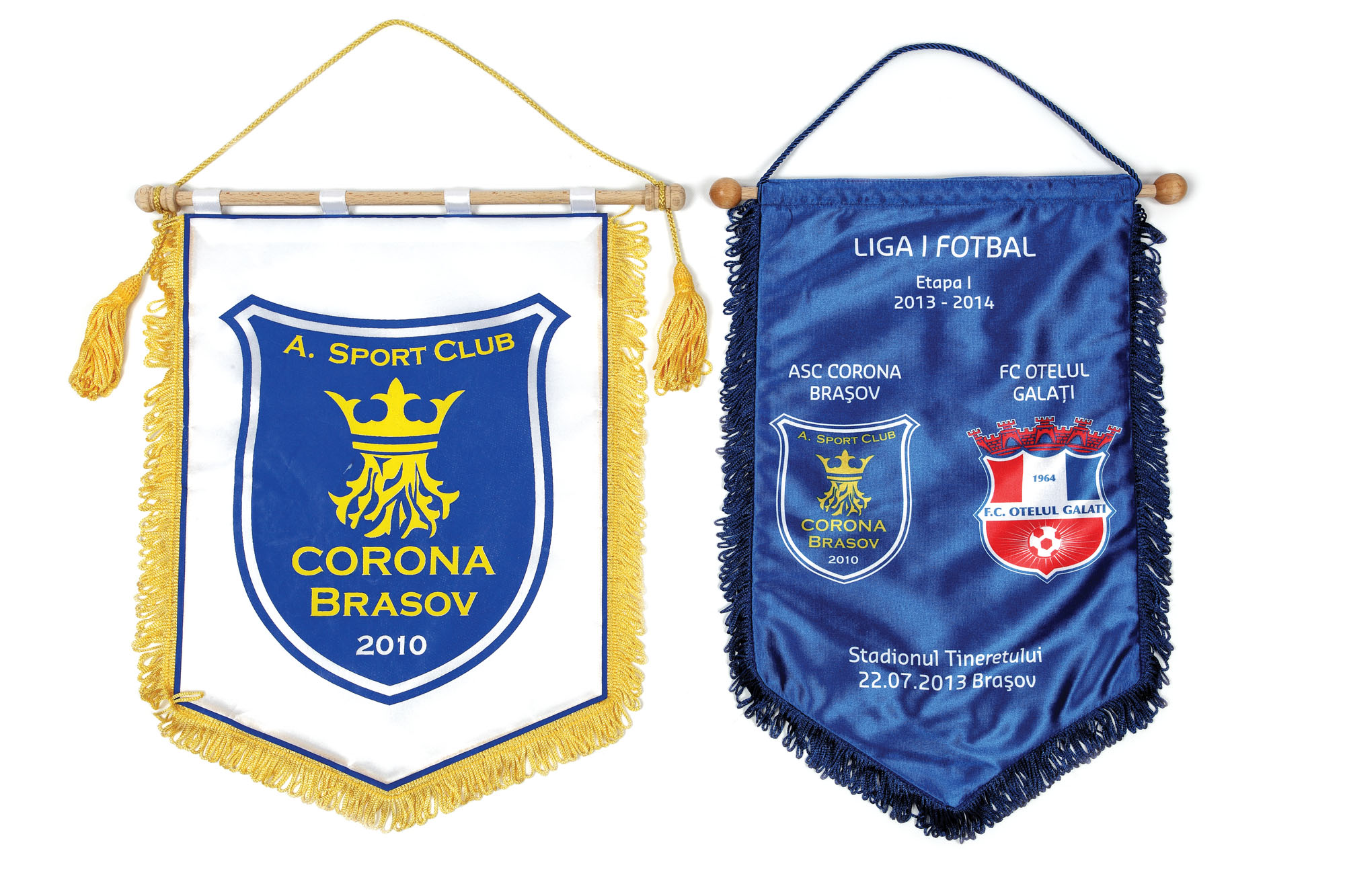 54. Lot format din 2 fanioane ale echipei ASC Corona Brașov, unul dintre acestea fiind de la meciul disputat între ASC Corona Brașov și FC Oțelul Galați, 22.07.2013