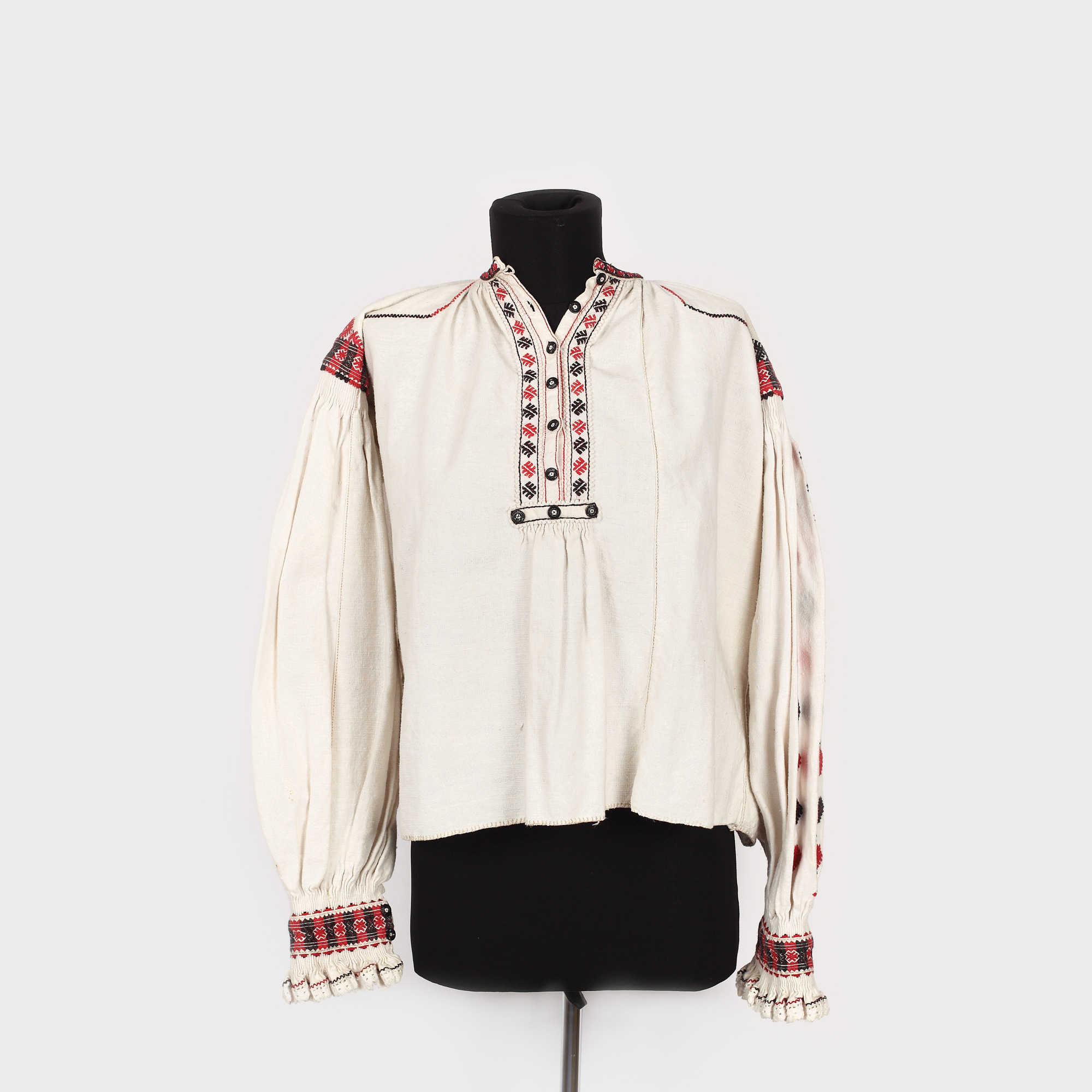 Cămasă dreaptă, cu mânecă prinsă din umăr și pavă la subraț. Mâneca este prinsă din umăr și strânsă cu brățară și volan, mărginit cu dantelă. Gura cămășii se află pe mijlocul feței, închisă cu nasturi de porțelan. Decorul este plasat pe guler, pe umăr, manșete, flancând gura cămășii și trei râuri de-a lungul mânecii. Motivele geometrice, romburi și romburi cu coarnele berbecului sunt străvechi simboluri solare de protecție și fecunditate. Cromatica respectă specificul zonei, dominantă de roșu și accente de negru.