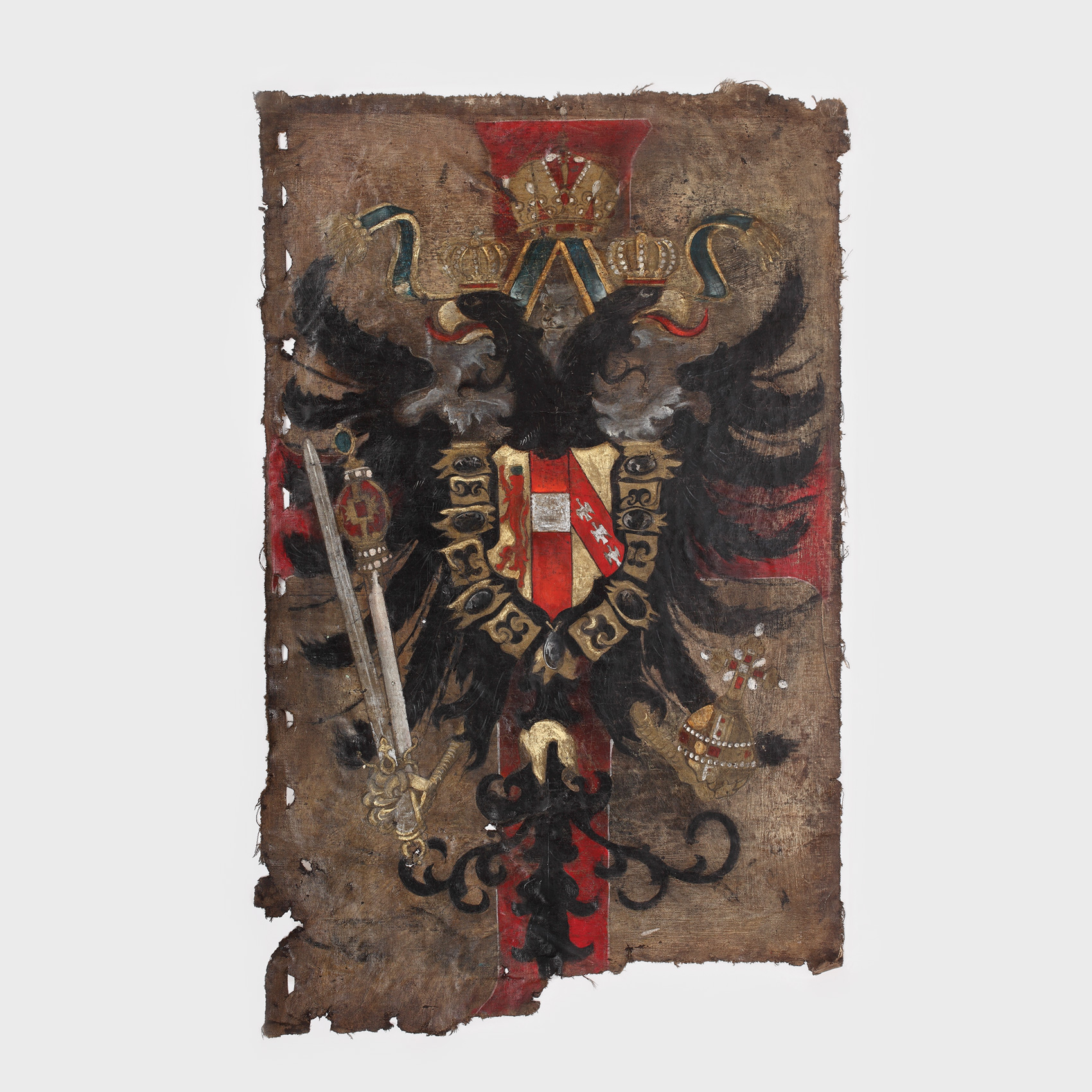 125. Steag (fragment de steag) al unui regiment de infanterie, probabil grăniceri, decorat cu stema Casei de Habsburg-Lorena. Cele câteva regimente de grăniceri active pe teritoriul transilvan au servit eliberării, prin înregimentare, a iobagilor transilvani l