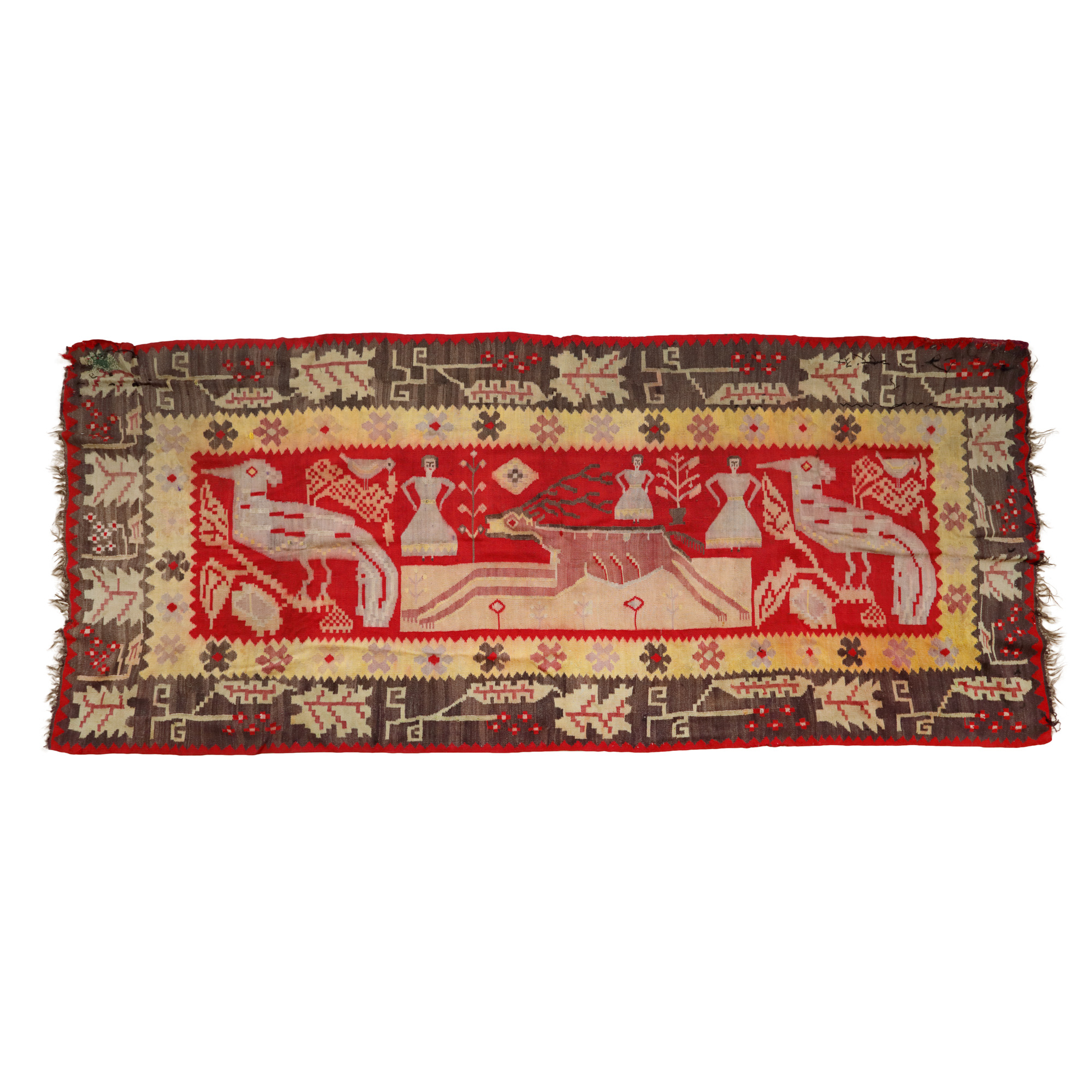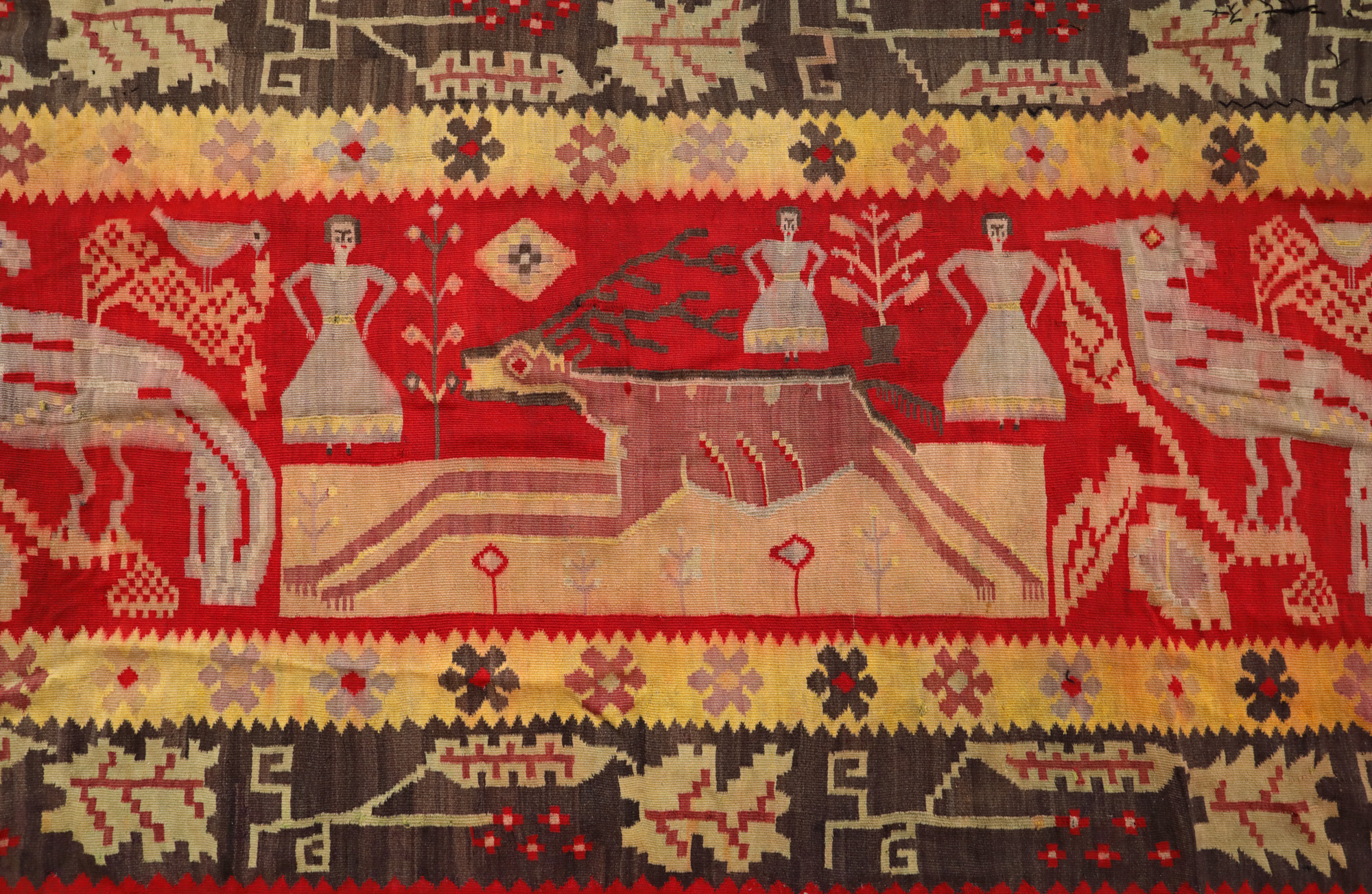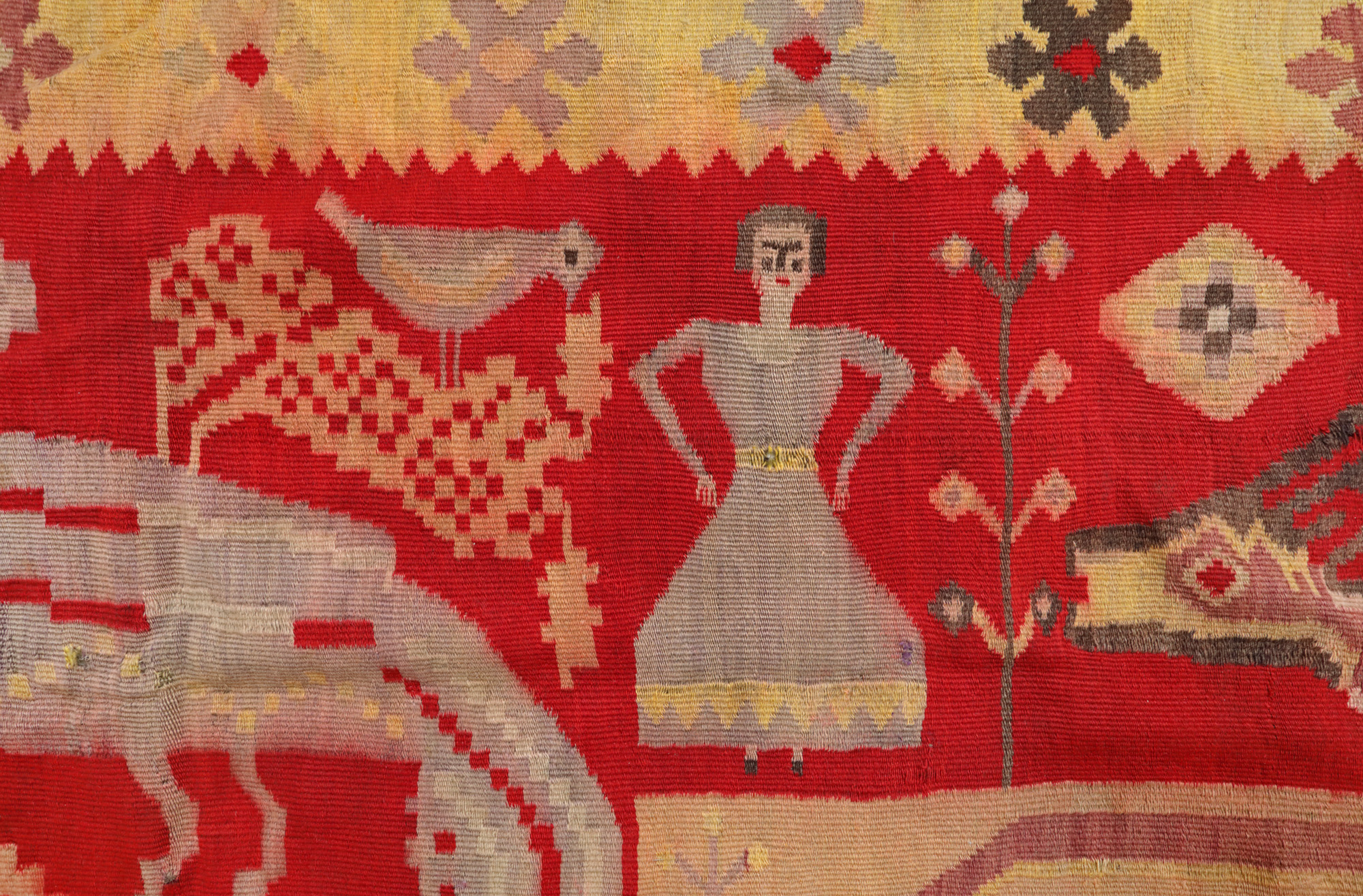 79. Covor basarabean din lână, decorat cu motive avimorfe, sfârșitul sec. XIX, provine din colecția artistei Eugenia Iftodi