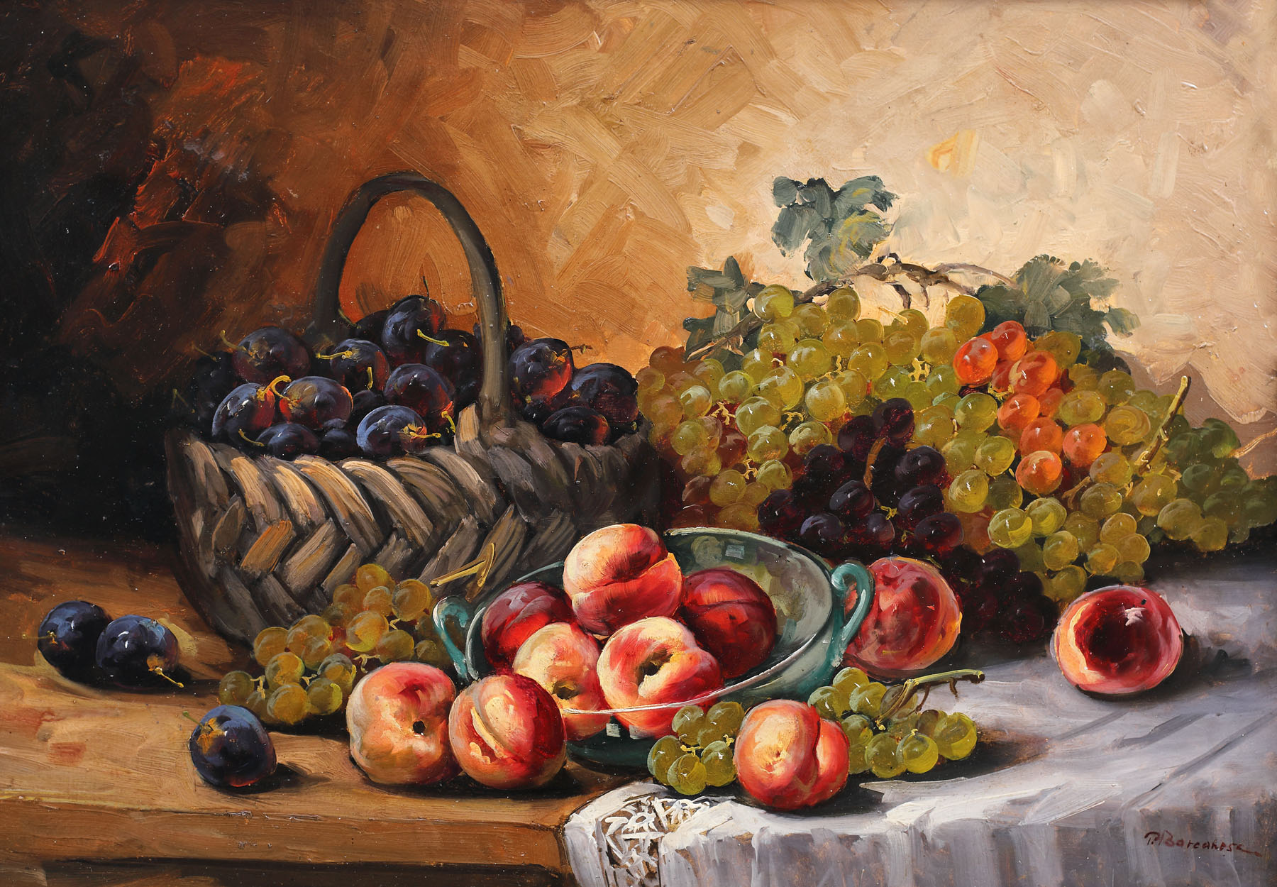 282. Natură statică cu coș cu prune, struguri și vas cu piersici