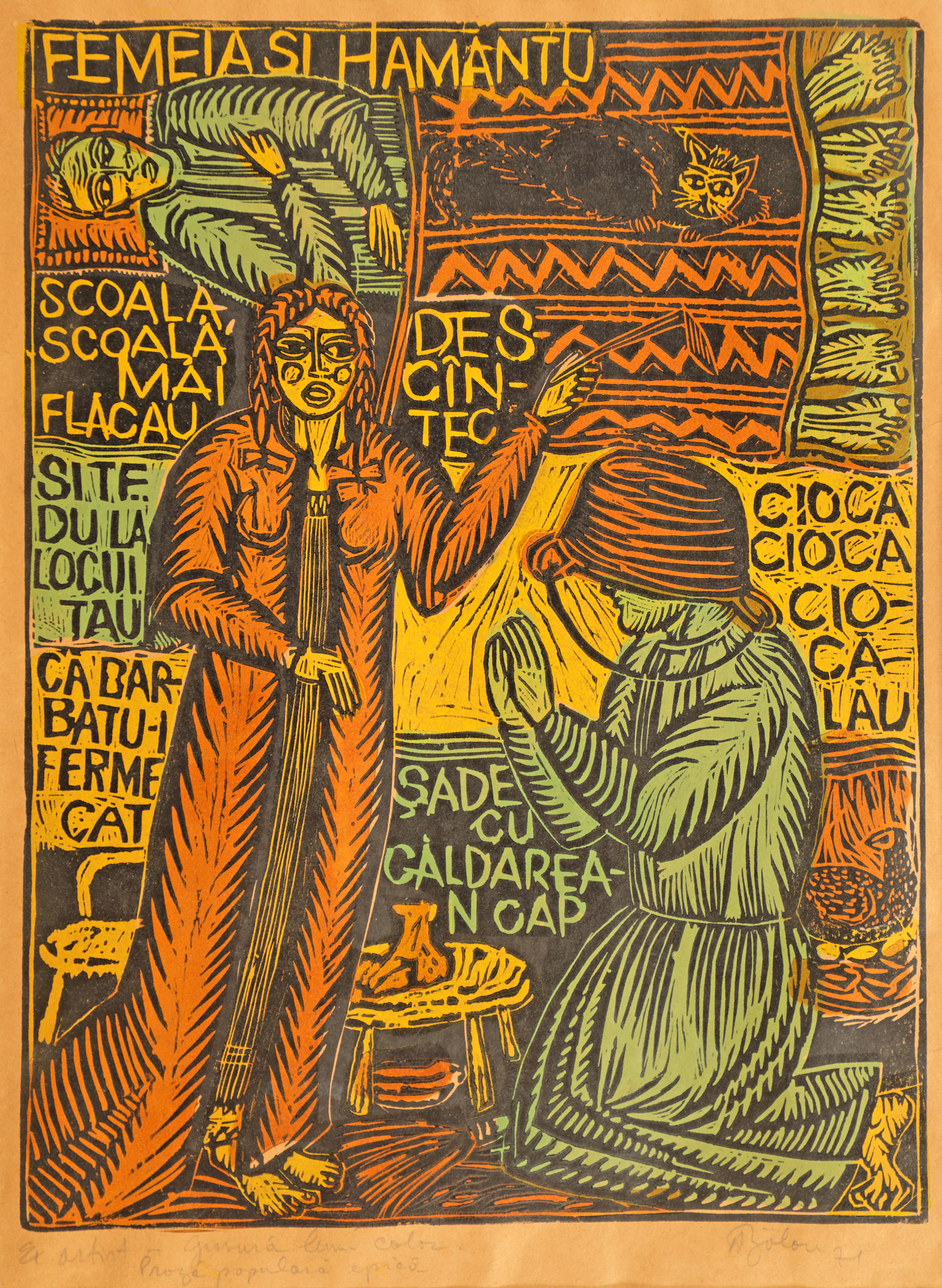 semnat și datat dreapta jos, în creion, "A. Bălan, (19)71"; notat stânga jos, în creion, "ex. artist, gravură lemn color, Proză populară epică"