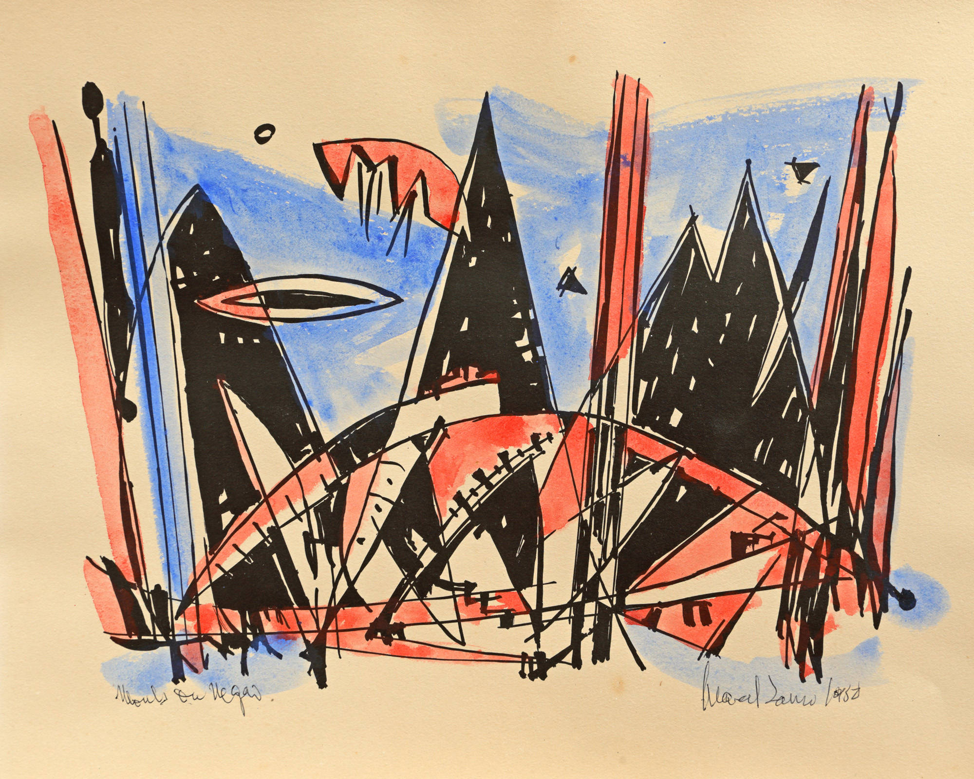 semnat și datat dreapta jos, cu negru, "Marcel Janco, 1938"; intitulat stânga jos, cu negru, "Moules"